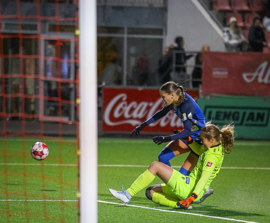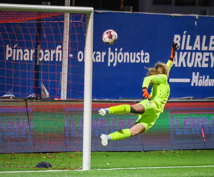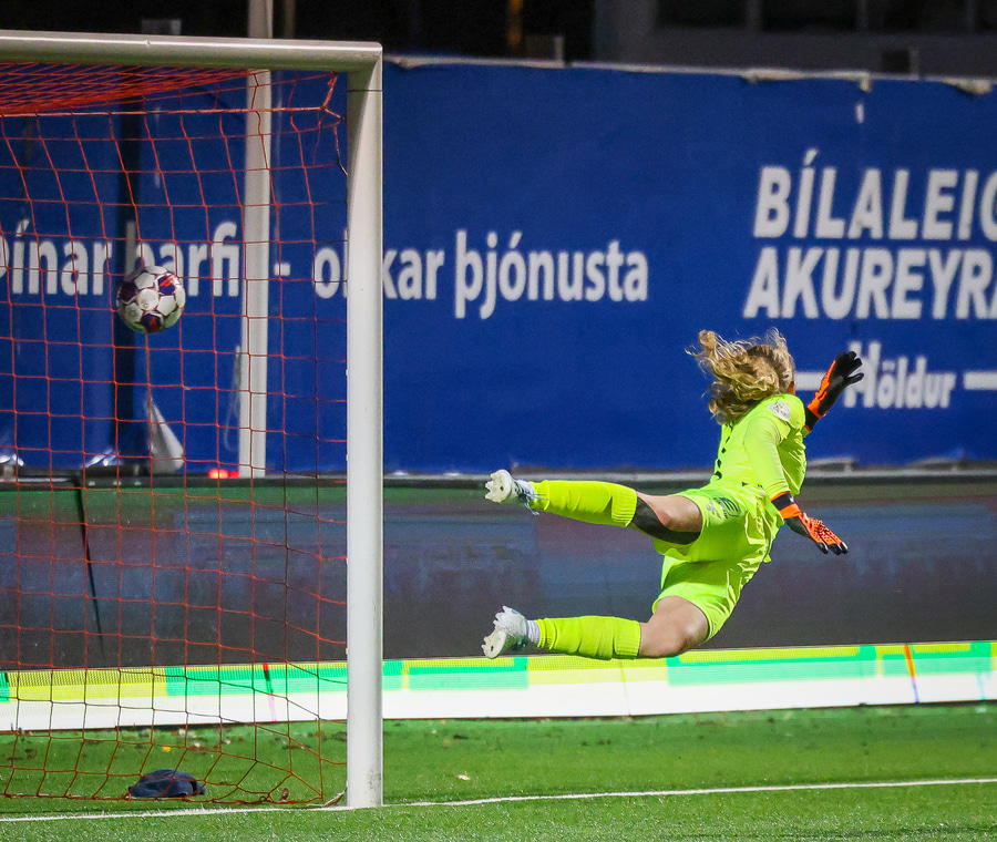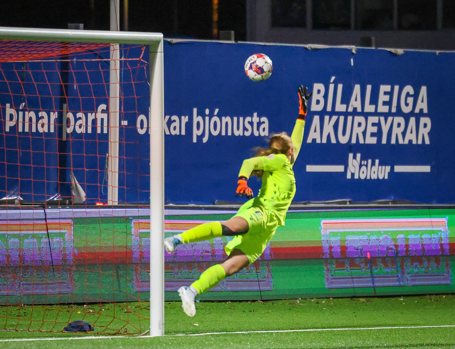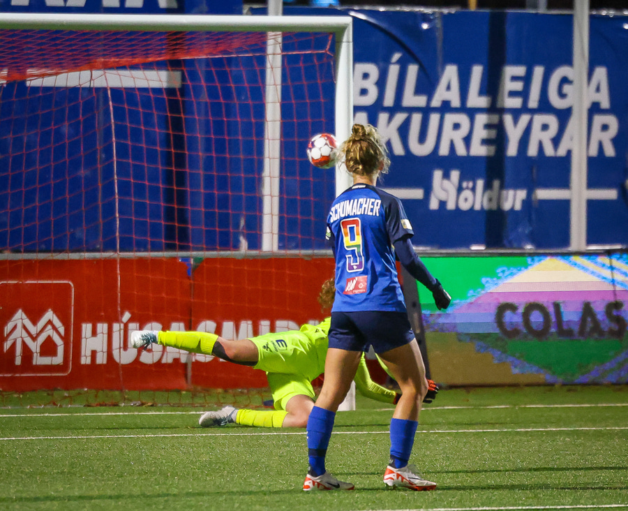 Valentina með boltann eiginlega á sama stað og Rita áðan og setur hann á sama stað í markinu nema aðeins neðar. Fanney nær fingrunum í boltann en það er ekki nóg.