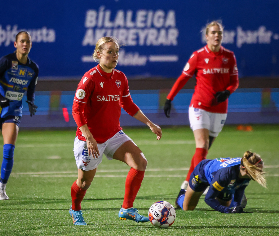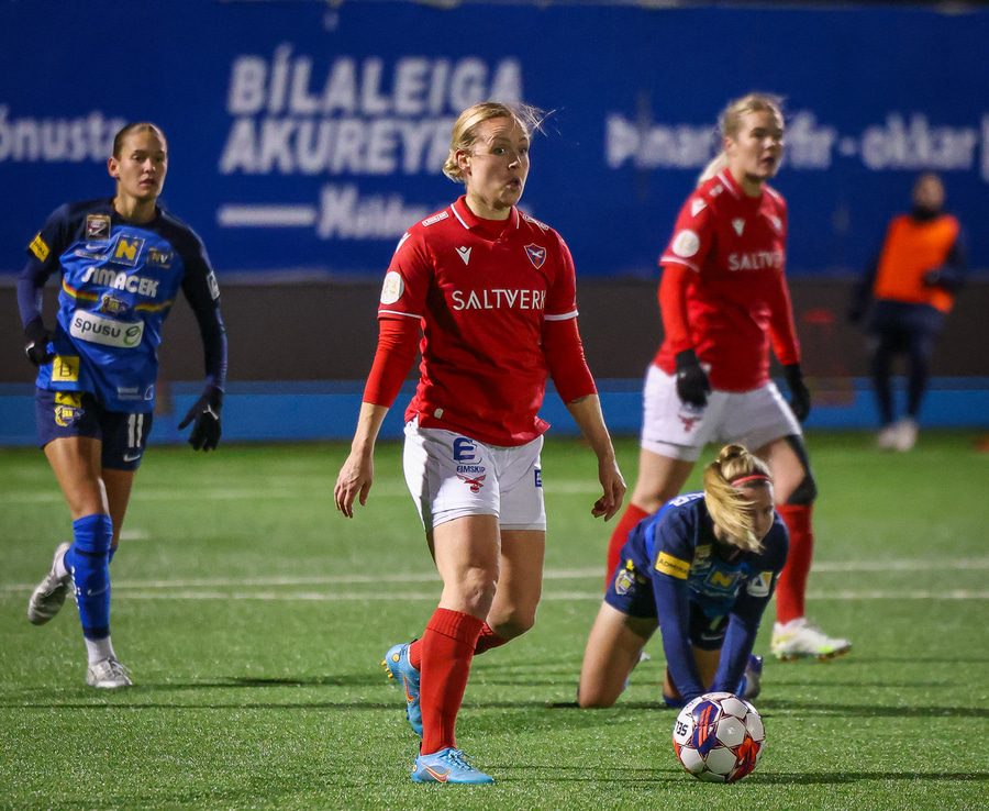 Berglind Rós tekur góðan snúning og ætlar svo að finna Málfríði í gegn en sendingin er of föst og ratar beint aftur fyrir markið.