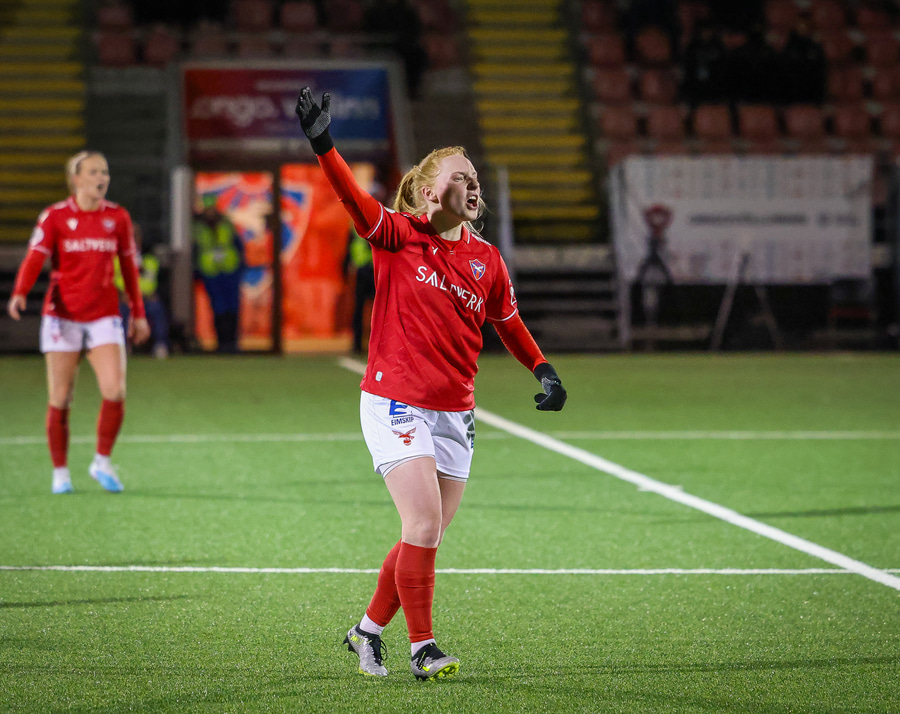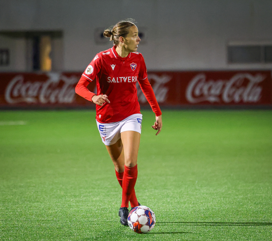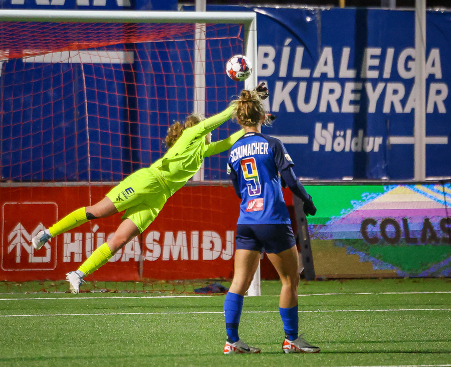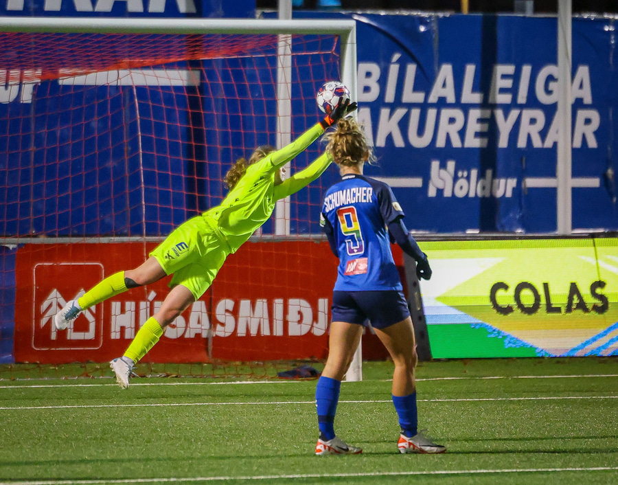 Fanndís með fyrirgjöf sem er of nálægt markinu og Carina Schlüter í engum vandræðum með að grípa hana.