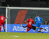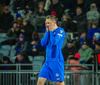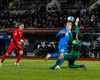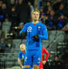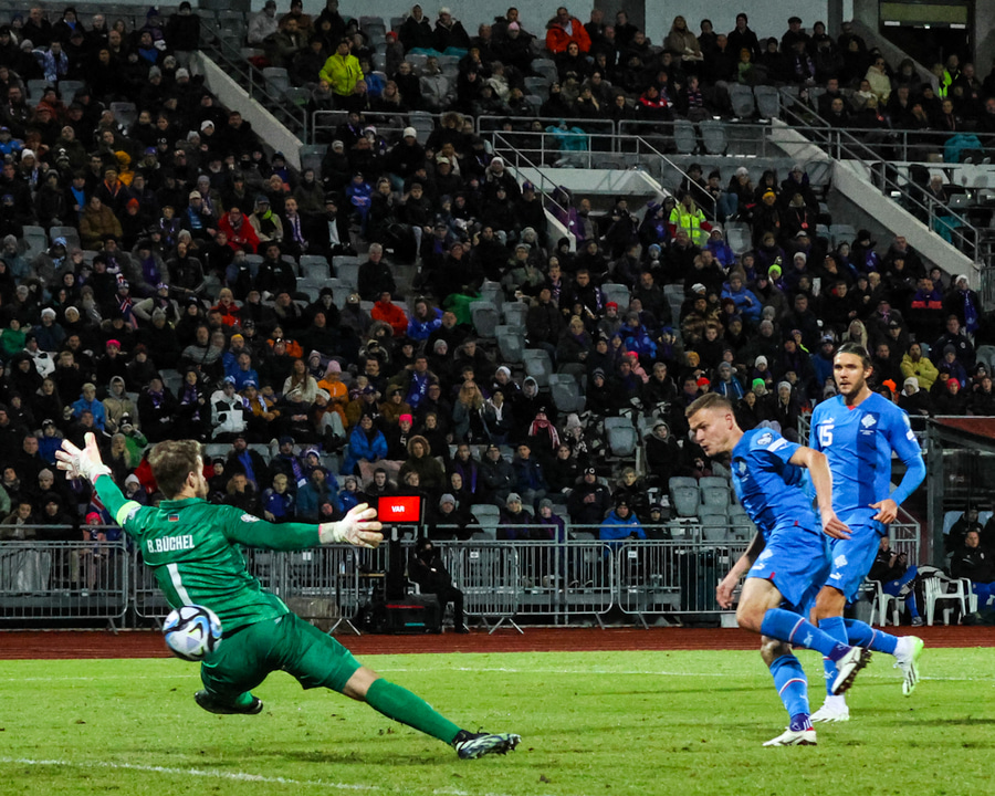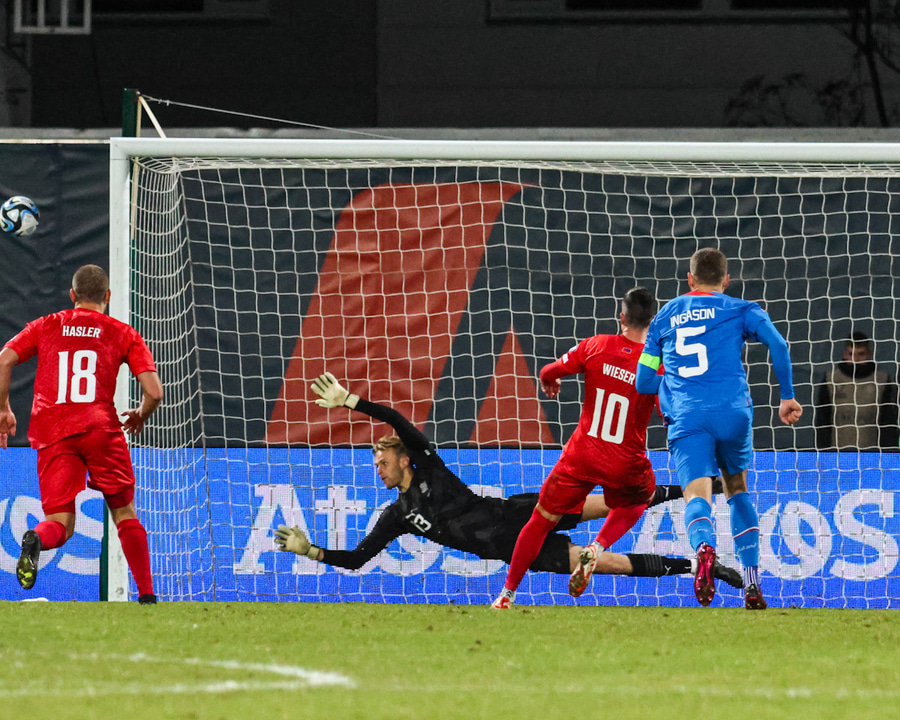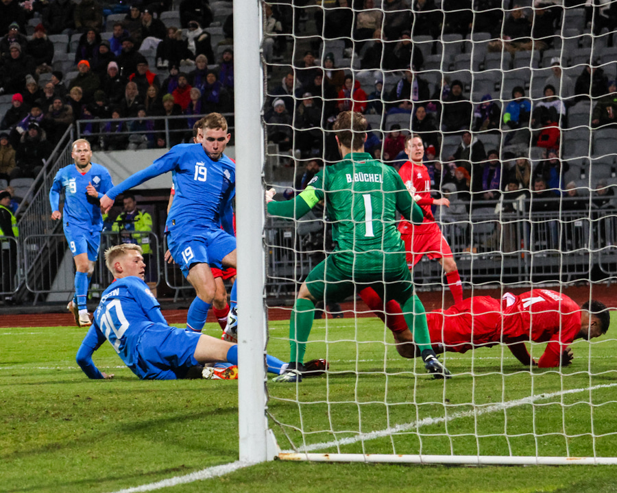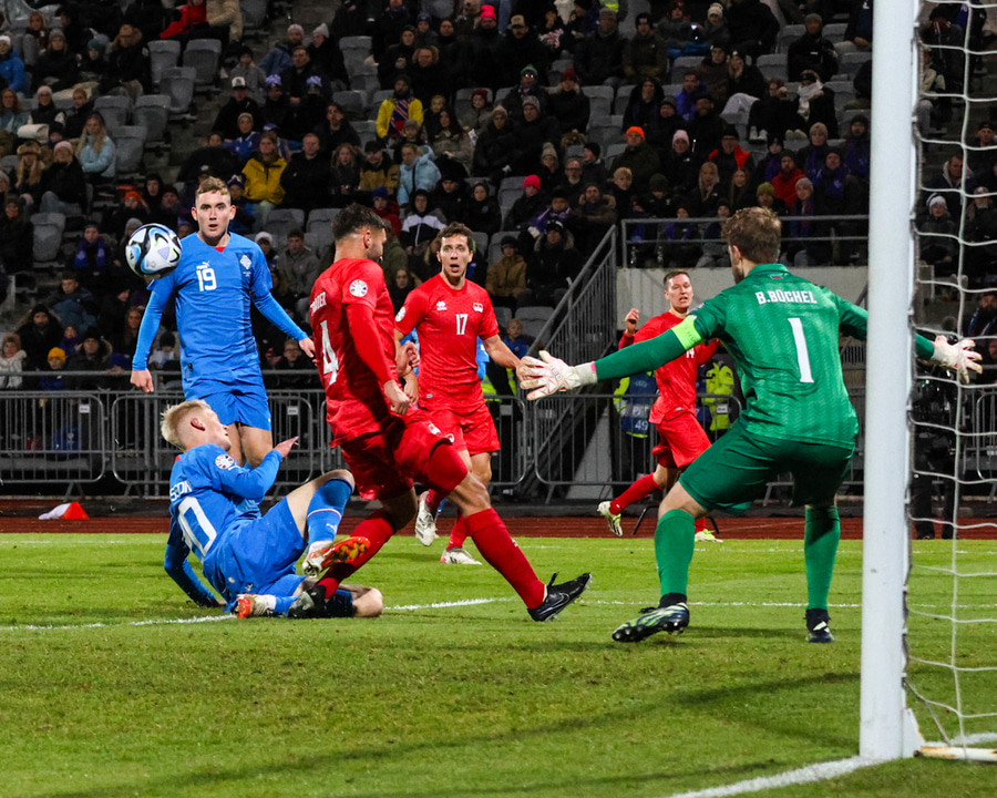 Jón Dagur nær frákastinu en skotið hans beint í fangið á Benjamin Buchel.