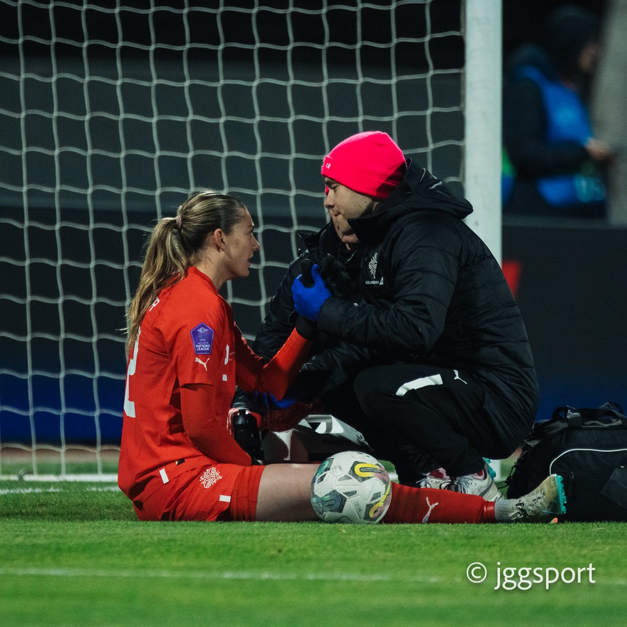 Hafrún Rakel liggur eftir og leikurinn er stöðvaður.