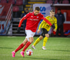 Tryggvi Hrafn er sloppinn í gegn og Árni Marinó klippir Tryggva niður og Valsmenn fá aukaspyrnu við vítarteigslínuna.
