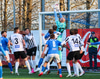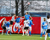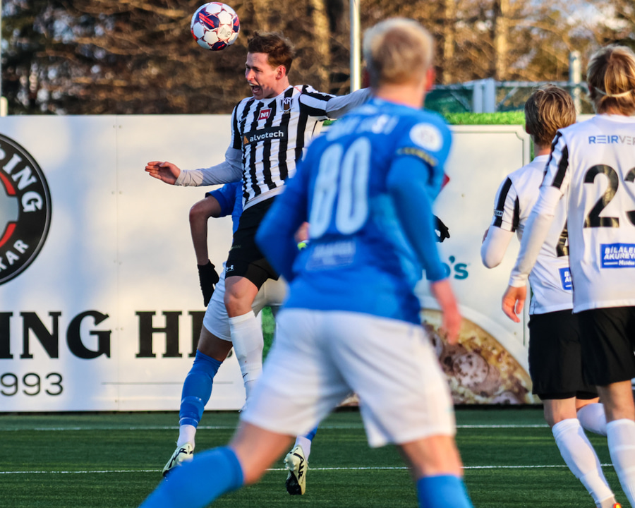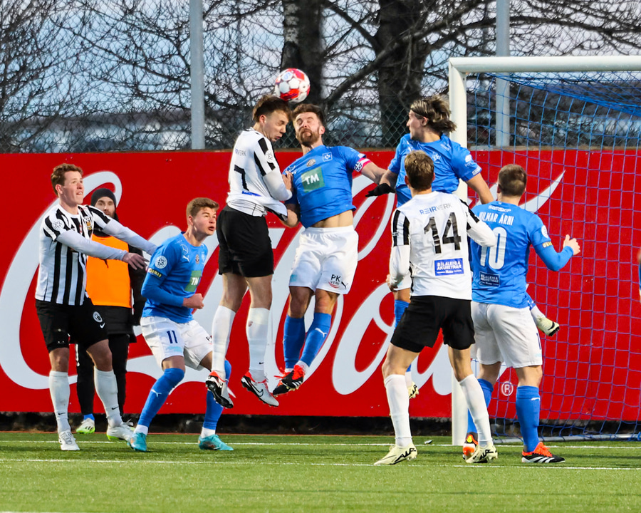 Finnur Tómas í séns á fjærstöng eftir hornið frá hægri en skalli hans framhjá markinu.