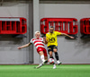 Vall með fyrirgjöf frá vinstri yfir á fjær. Jón Gísli mætir og vonnur einvígið og nær skalla á markið. Arnar mættur og grípur boltann.