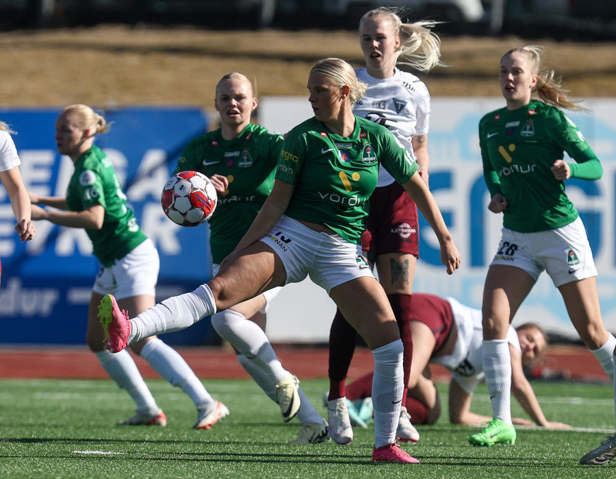 Áslaug Munda með geggjaða hornspyrnu og Anna Nurmi setur boltann í stöngina. Þarna átti hún að gera mun, mun betur.