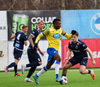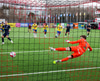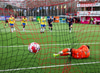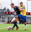 Fær boltann einn gegn Aroni frá Degi Inga en Aron Dagur gerir sig breiðan og ver vel.
