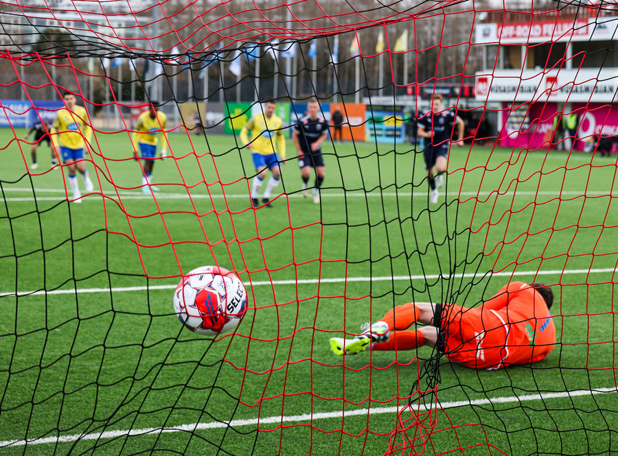 Ion Perello með boltann fyrir markið frá vinstri á Hrannar Inga sem nær að lyfta boltanum yfir Halldór í markinu, Varnarmaður hreinsar af marklínu. Hrannar sannfærður um að boltinn hafi farið inn en dómarar ekki á sama máli.