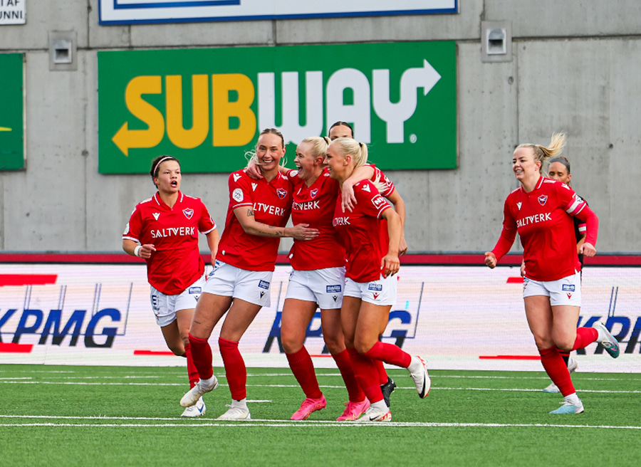 Víkingar byrja þetta af krafti. Vinna innkast hátt á vellinum. Emma Steinsen fær svo boltann úti hægra megin og neglir boltanum inn á teiginn. Þar er Hafdís Bára mætt og hún skallar boltann yfir Fanneyju í markinu.