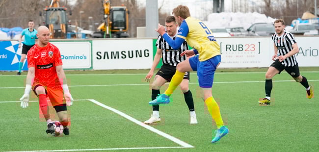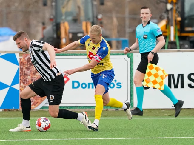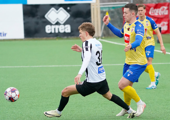 Ásgeir Sigurgeirsson kemst inn í sendingu til baka á Guy Smit, sem að þrumar hann niður. Ásgeir stendur fljótt upp aftur og ætlar að vaða í átt að markinu, en Twana Khalid flautar alltof snemma!