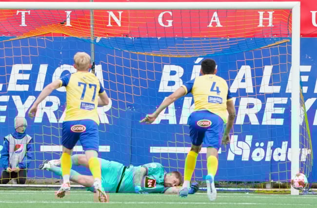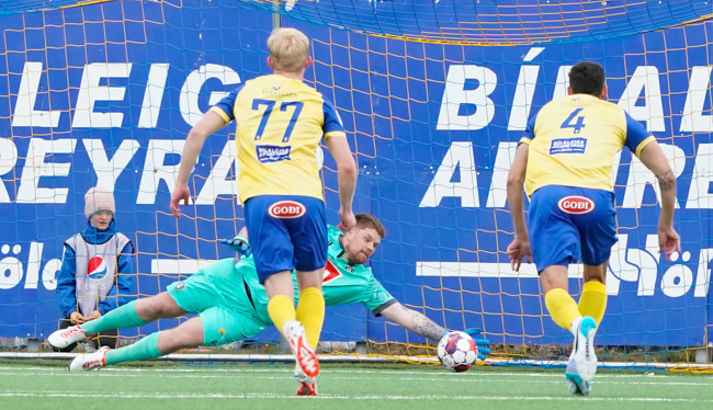 Benóný setur þéttingsfasta spyrnuna niðri í hægra hornið, en Steinþór ver boltann í horn!