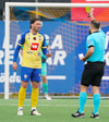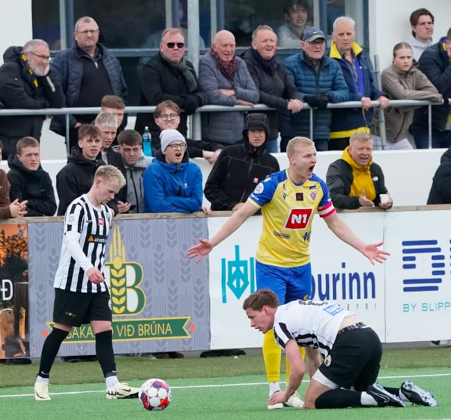Elfar Árni er dæmdur brotlegur í baráttu við Axel Óskar og klappar kaldhæðnislega fyrir aðstoðardómaranum, sem að flaggaði brot á hann. Það er full mikil orka að fara í dómarapirring hér.