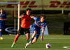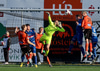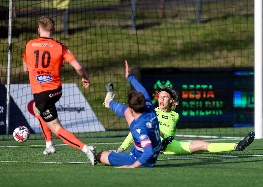 Fylkismenn lyfta boltanum inn fyrir teig HK. Stefán kemur út úr marki HK og rennur og Þórður Gunnar þakkar fyrir það og setur boltann í autt netið.