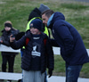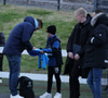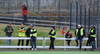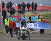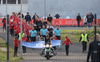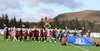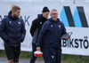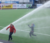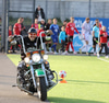 Leikmenn labba inn á völlinn en á undan þeim kemur einn nagli á svakalegu mótorhjóli!