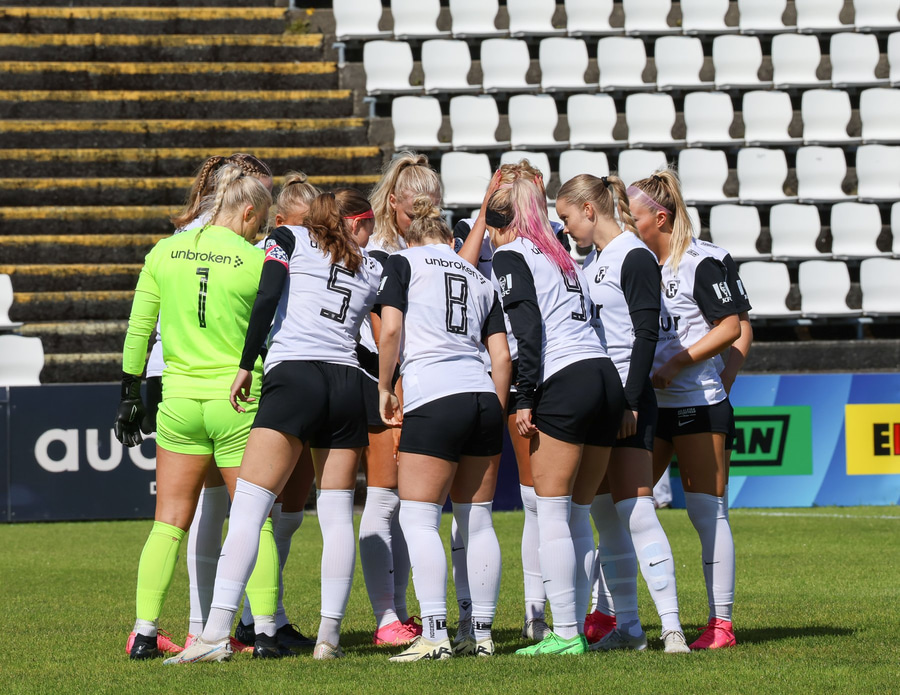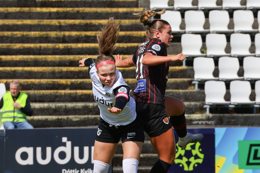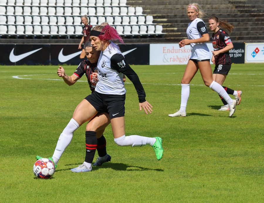 Hvað er í gangi!? Endanna á milli þessar mínúturnar. Í þetta sinn er það Bergdís sem á fast skot í átt að marki FH. Hittir hann vel en boltinn hafnar í slánni.