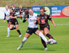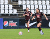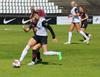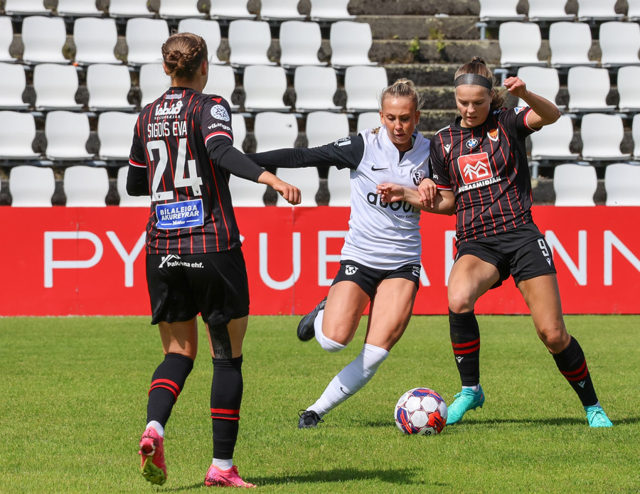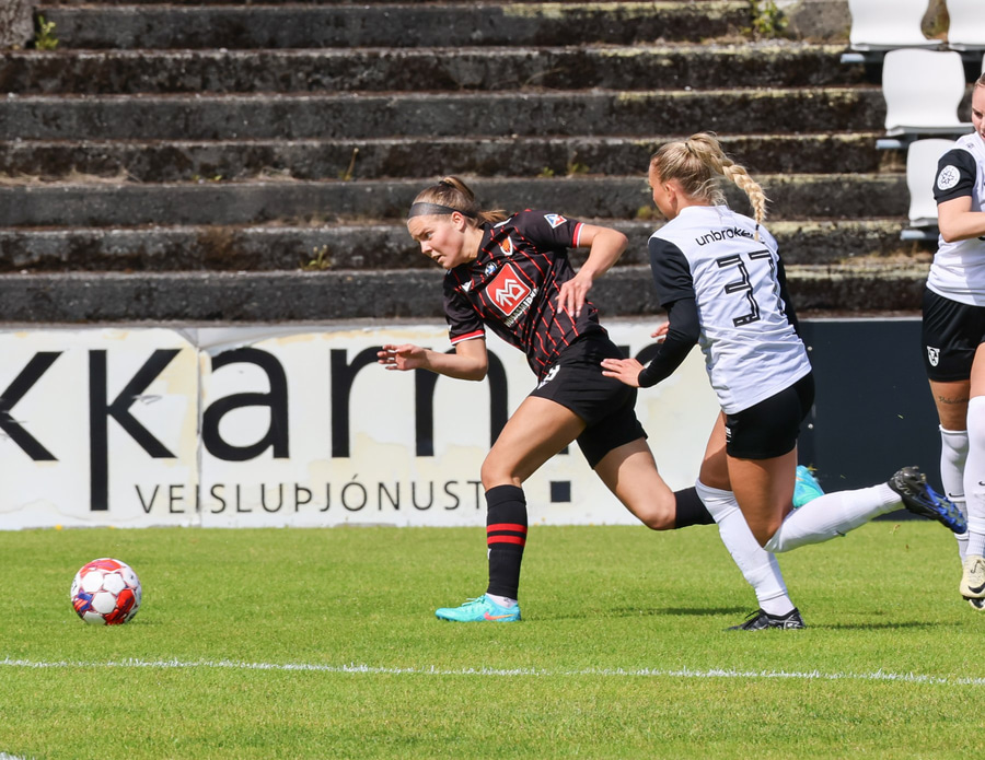 Víkingur í skyndisókn. Sigdís fær boltann úti vinstra megin, snýr inn á völlin og skýtur. Með mann í sér og skotið framhjá.