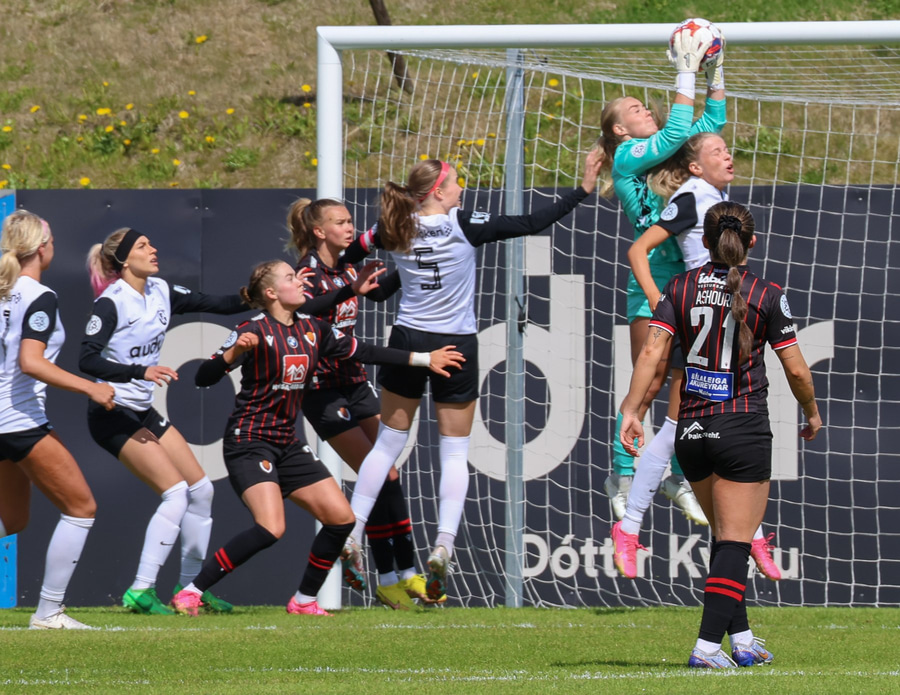 Þær voru ekki lengi að jafna þetta! Boltinn fyrir og Snædís skallar í átt að marki. Birta í þessu en nær ekki að halda boltanum úti.