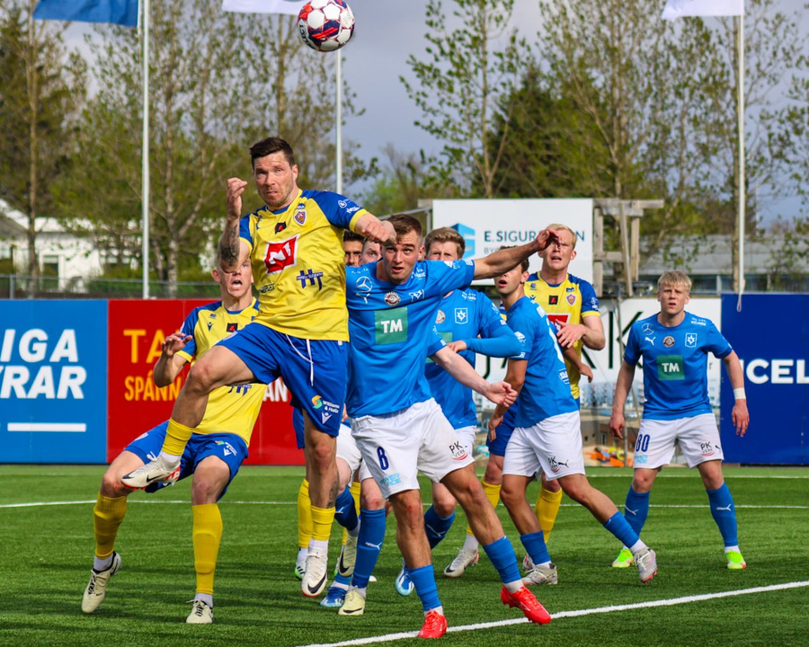 Óli Valur með flottan sprett upp kantinn í skyndisókn. Hann reynir sendingu fyrir en Hans kemst fyrir en boltinn fór næstum í eigið net. Rétt framhjá.