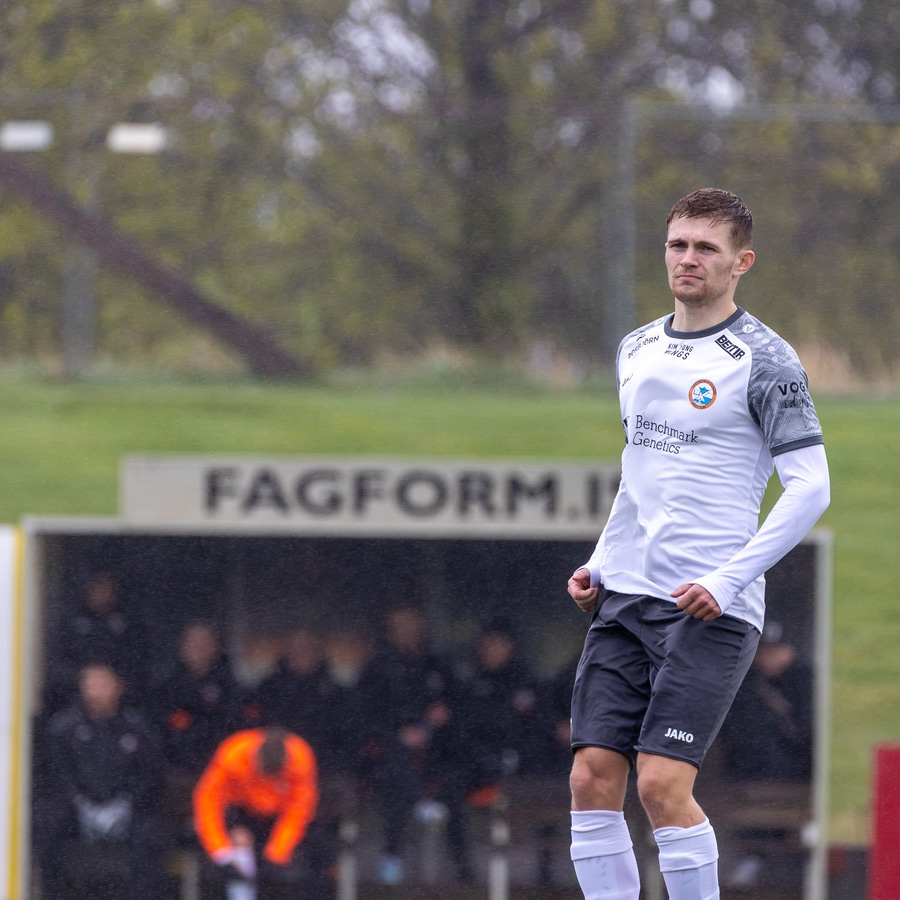 Boltinn rennur þægilega til Jóns sem lætur vaða af löngu færi og hann smell hittir boltann en Benjamín ver frábærlega