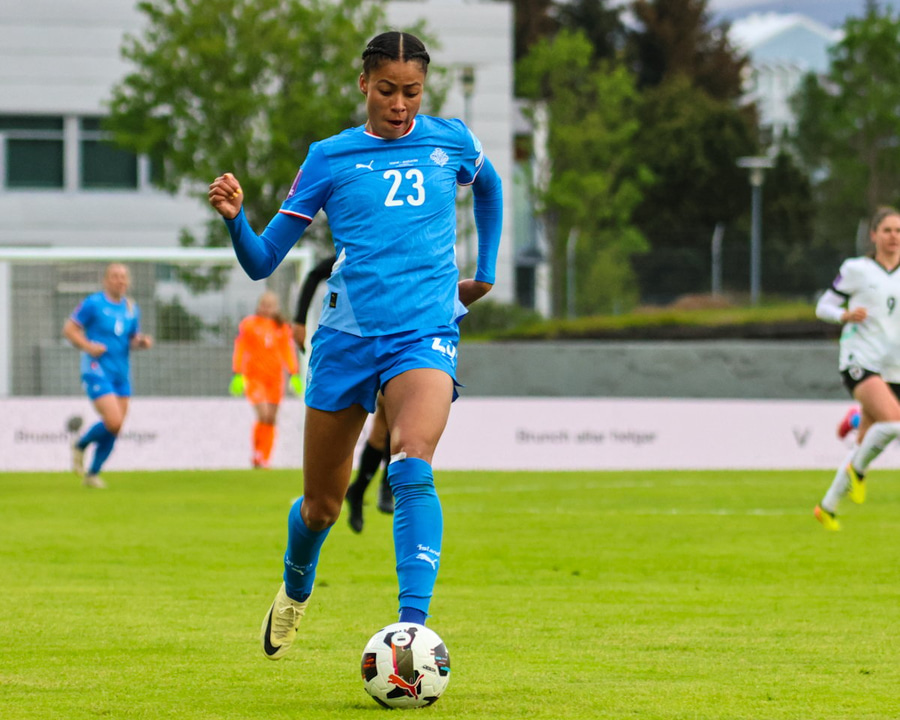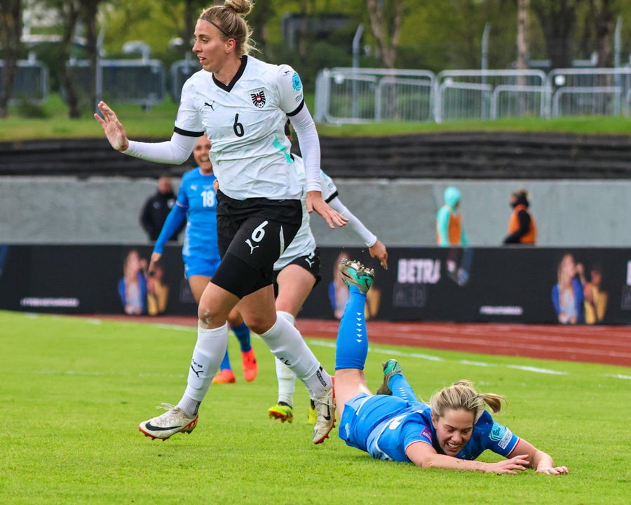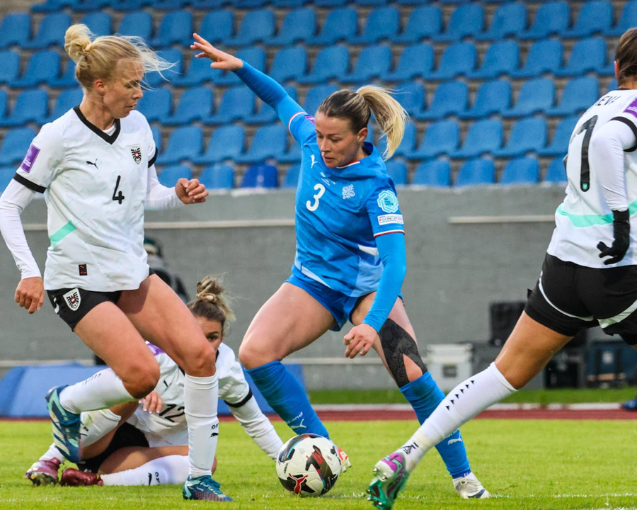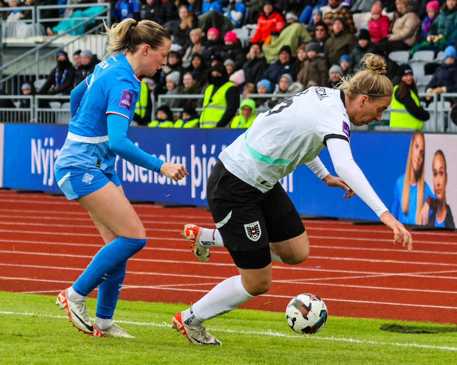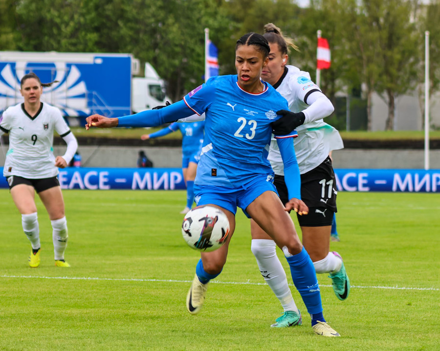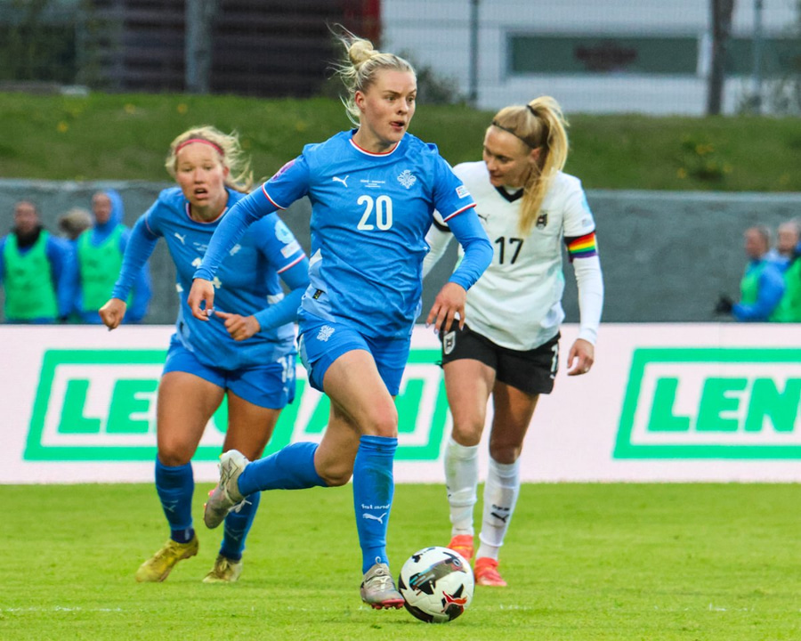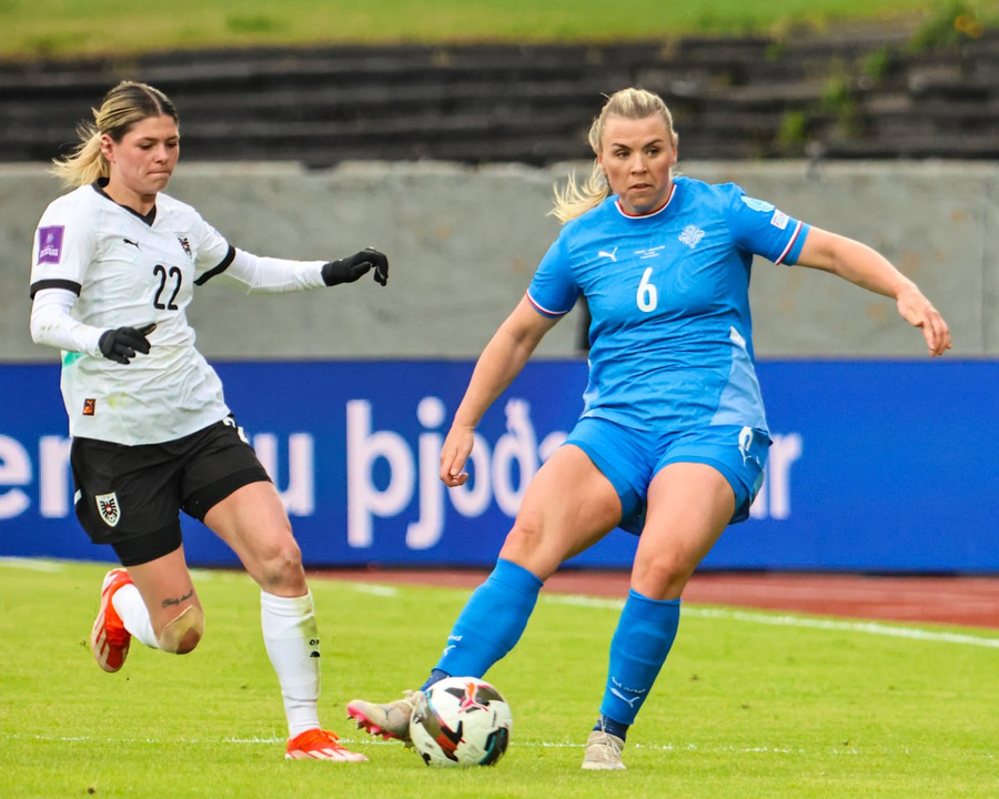 Austurríska liðið ræður ekkert við Sveindísi þegar hún kemst á ferðina. Sarah Zadrazil heppin að sleppa við spjaldið þarna.