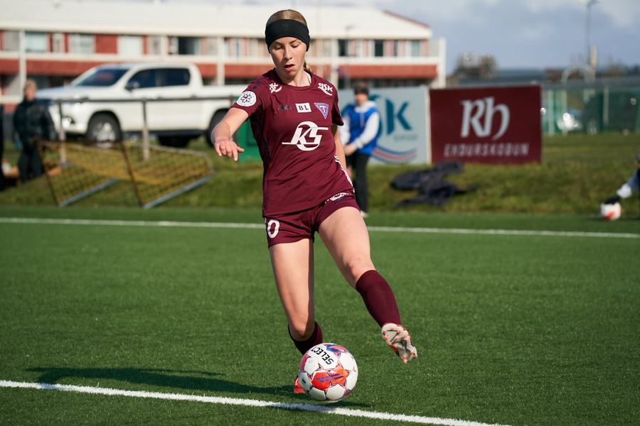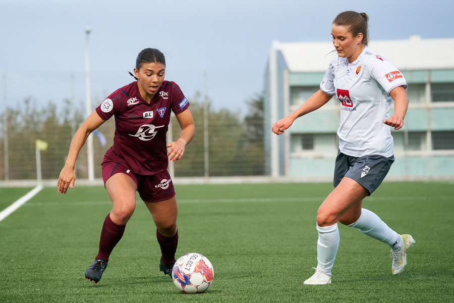 Sigdís Eva með laglegan sprett upp vænginn, kemst alveg upp að endamörkum og nær fínni fyrirgjöf en heimakonur fyrstar á boltann og skalla frá marki sínu.