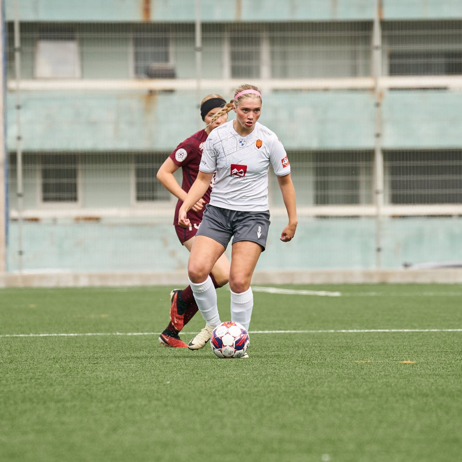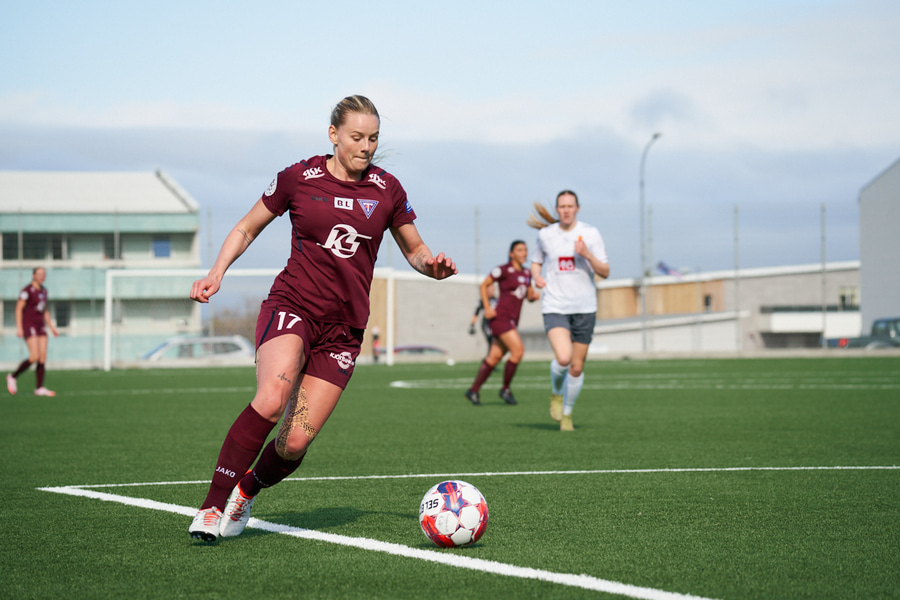 Rachel Diodati með fyrsti tilraun dagsins, lang innkast Sigdísar skallað frá. Boltinn fyrir fætur Rachel sem tekur boltann með sér og nær skoti en framhjá markinu,