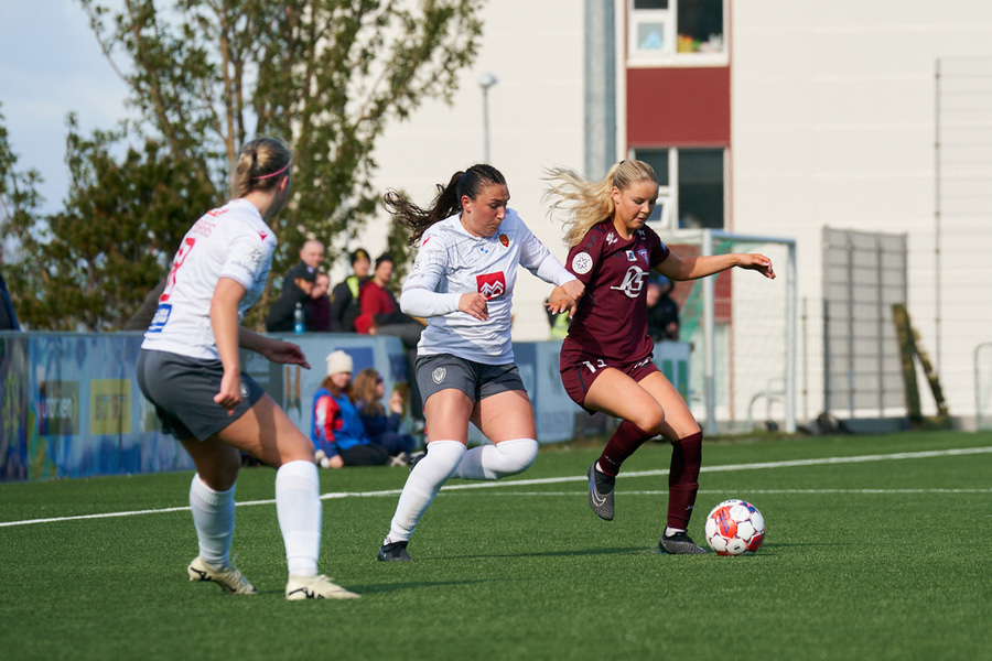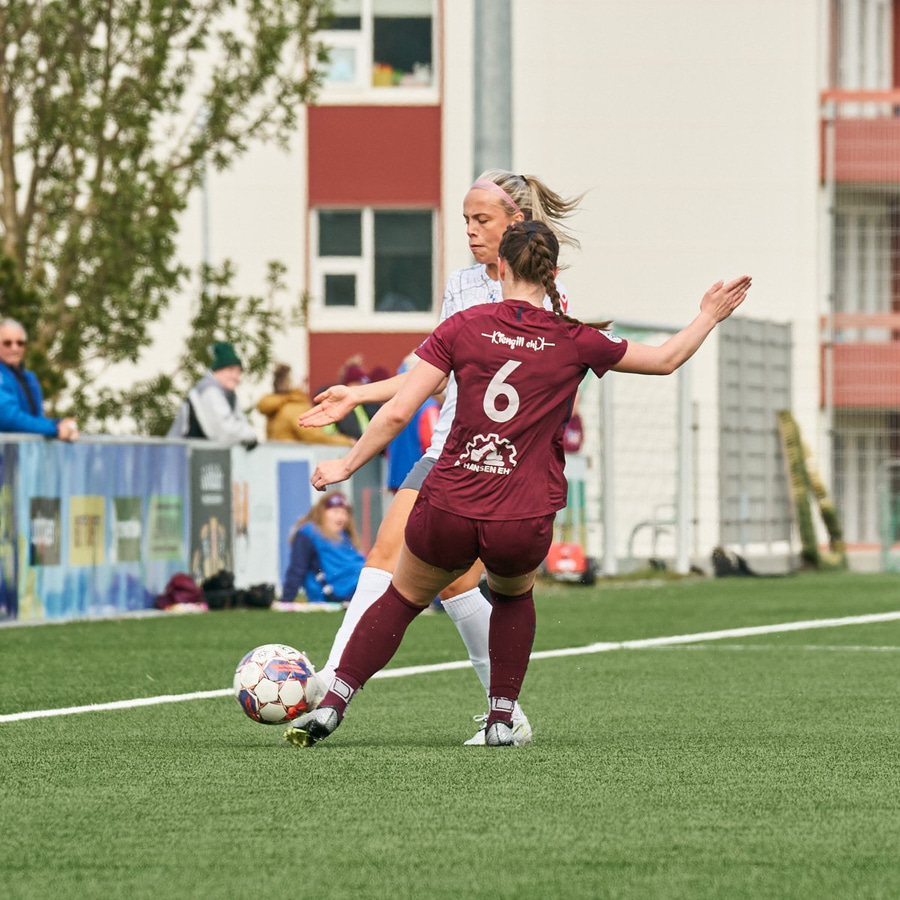 Elísa Bríet sleppur ein gegn Birtu en Rachel eltir hana uppi og rennir sér í boltann og nær að fipa hana nog til þess að hún nær ekki skotinu.