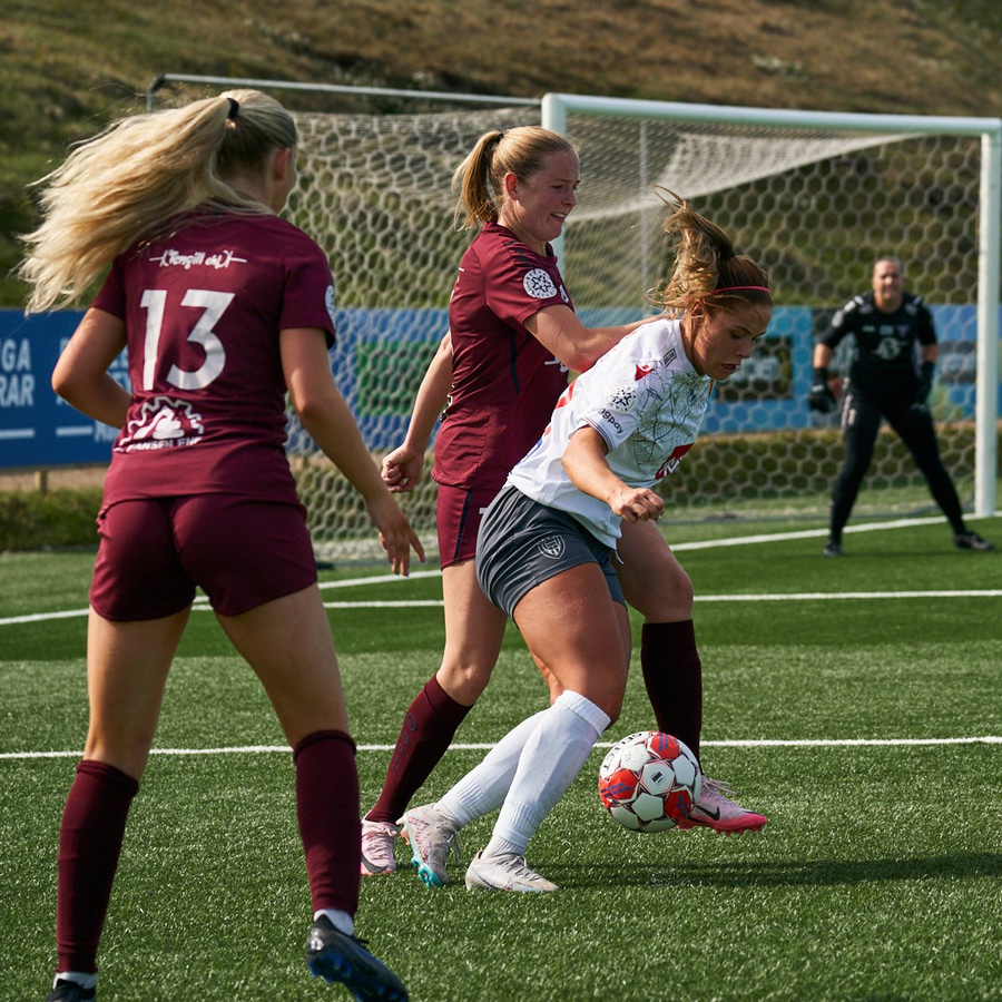 Svanhildur Ylfa við það að prjóna sig í gegn eftir sendingu frá Shainu en nær ekki að finna markið.