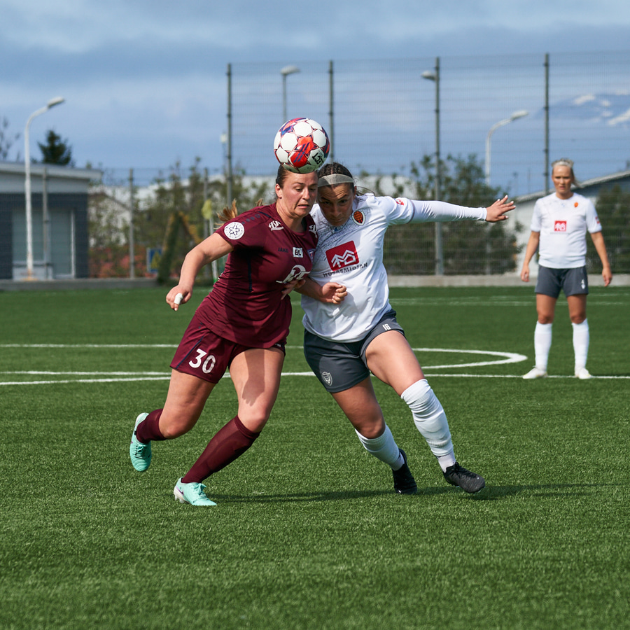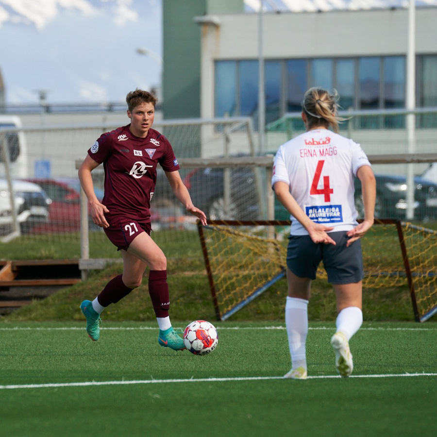 Lara Margrét Jónsdóttir í dauðafæri eftir fyrirgjöf frá hægri, kemst framfyrir Birtu sem mætir út úr markinu en nær ekki að koma boltanum á markið. Birta vinnur til baka og handsamar svo boltann.