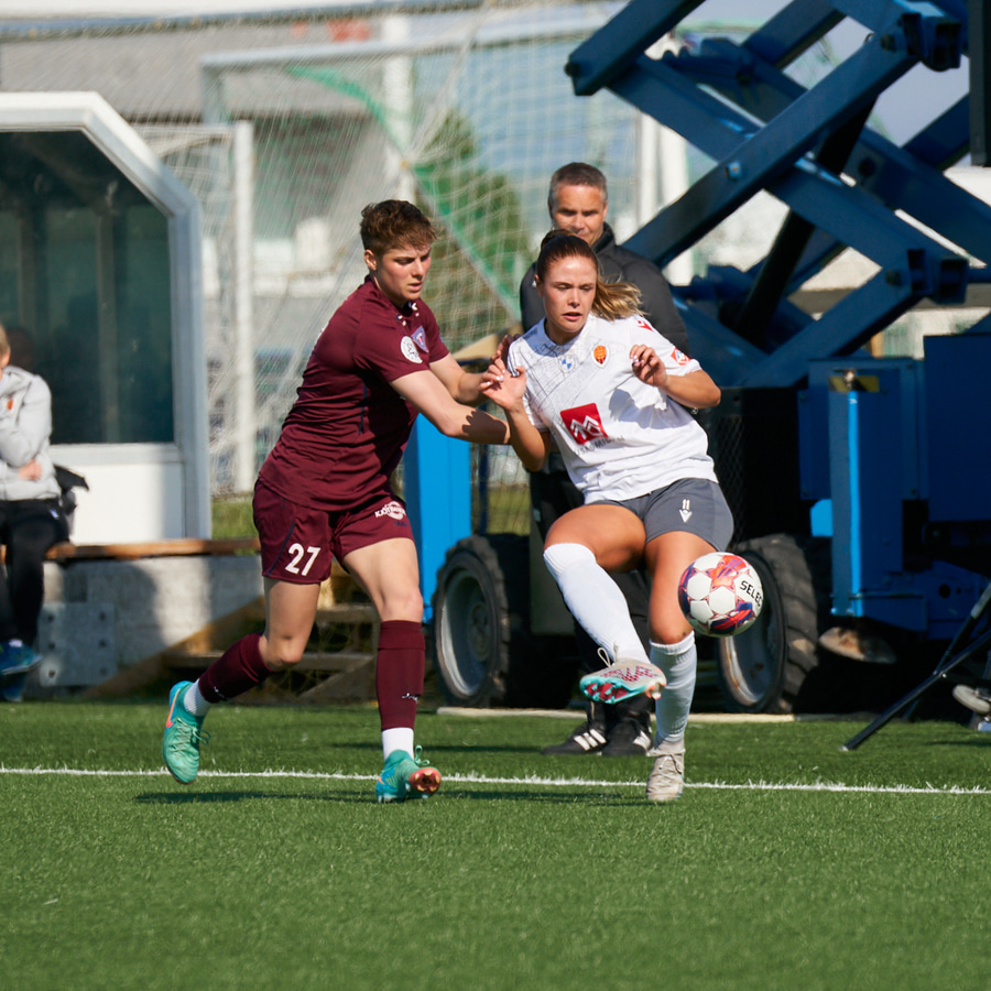 Sigdís hársbreidd frá því að sleppa innfyrir vörn Tindstóls en Bryndís Rut með virkilega góðan varnarleik og krækir í boltann af henni.