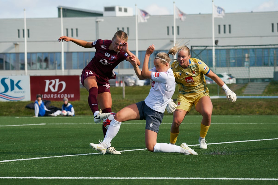 Hættulegur bolti fyrir markið frá hægri frá Bergdísi. Hafdís Bára og Sigdís báðar með möguleika á að ráðast á boltann sem siglir þó afturfyrir.