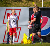 Þá ganga liðin til vallar og klappa til stuðningsmanna.