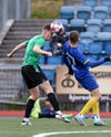 Tomas Bjarki með flottan bolta fyrir markið en Oumar Diouck nær ekki að koma skallanum á markið.
