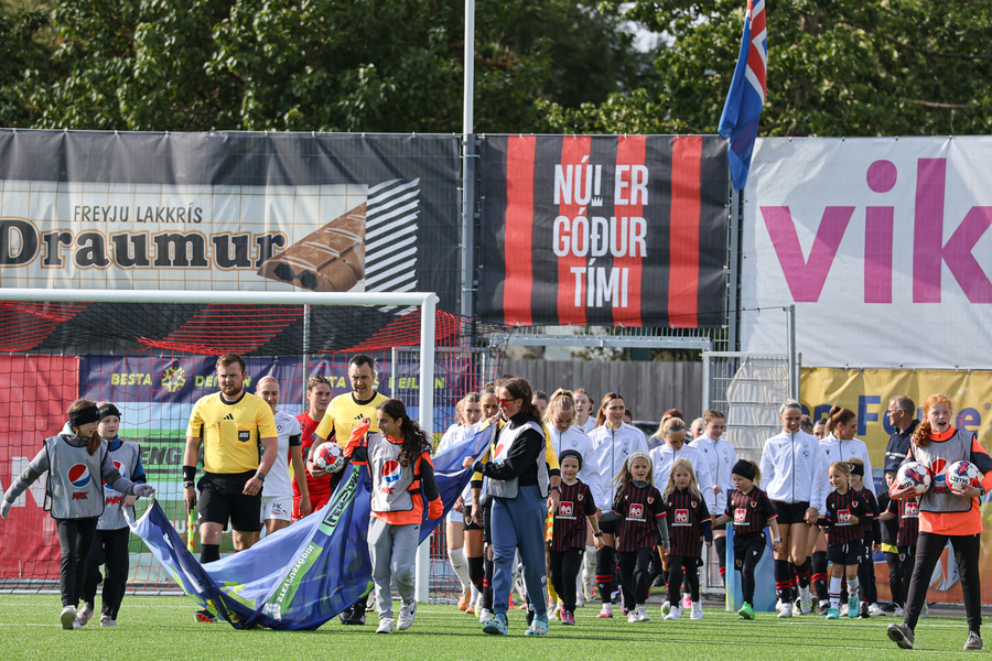 Leikmenn ganga nú inn á völlinn. Þetta fer að byrja!