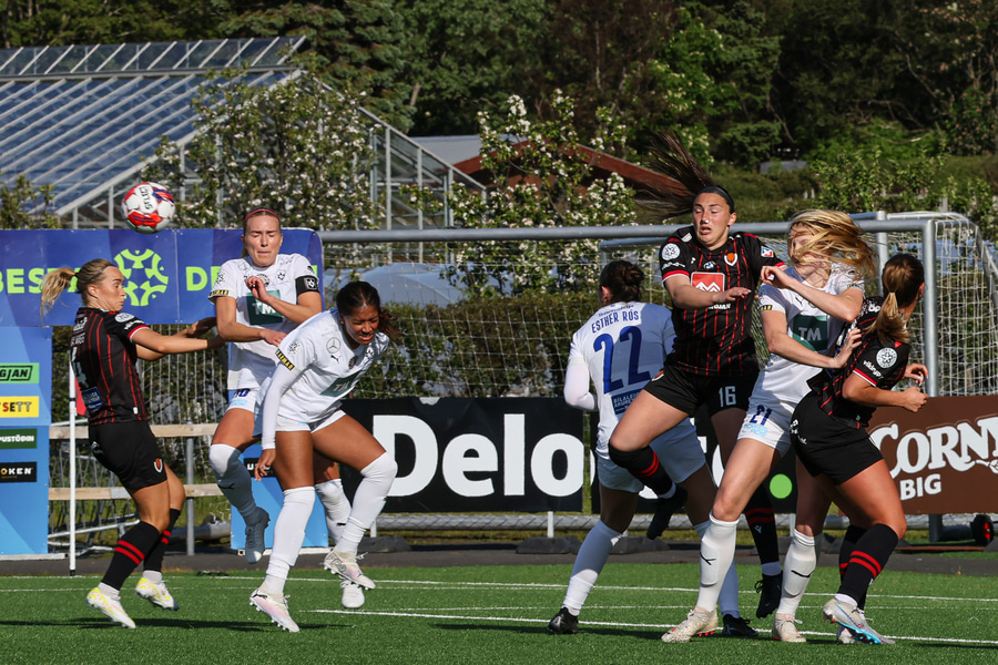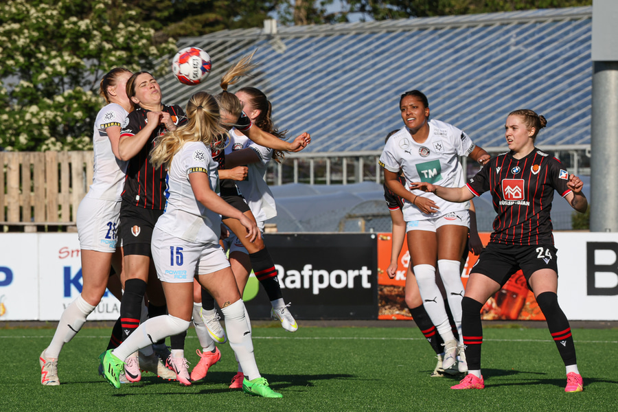 Gott horn inn á teiginn og berst á Shaina. Hún skýtur og boltinn í slánna! Boltinn skoppar aftur út í teig og eiga Víkingskonur skot á mark en gestirnir bægja hættunni frá.