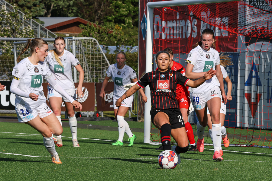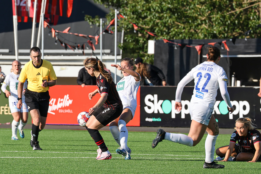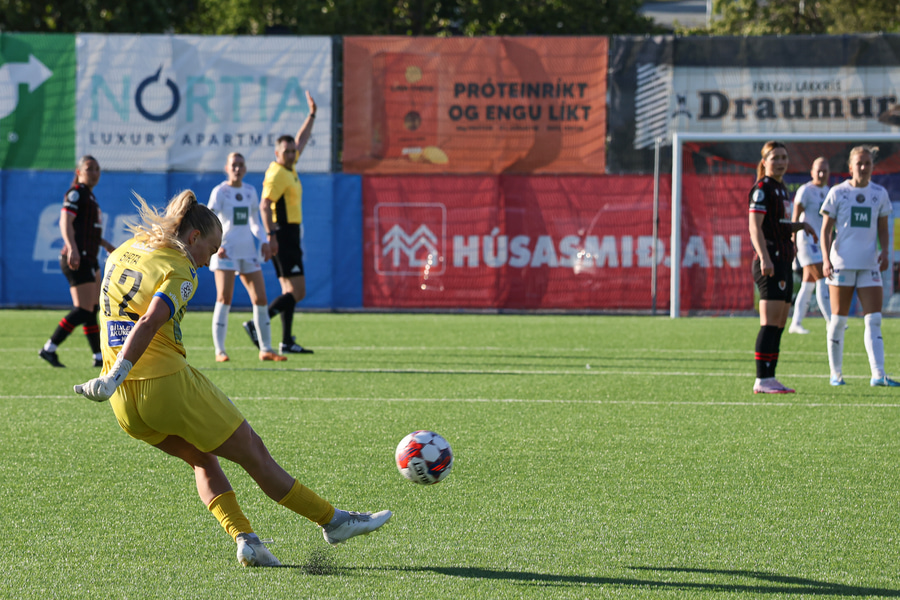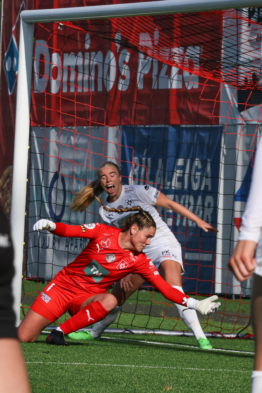 Boltinn berst á Gígju, sem er fyrir utan teig, og hún tekur skot í fyrsta. Fast skot en boltinn yfir