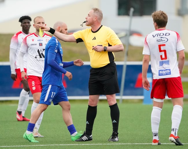Stígur inn í Ingimar á sprettinum og uppsker gult spjald.