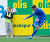Brot dæmt og Birkir sparkar boltanum í burtu.