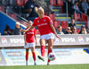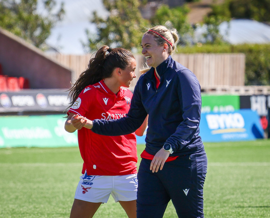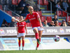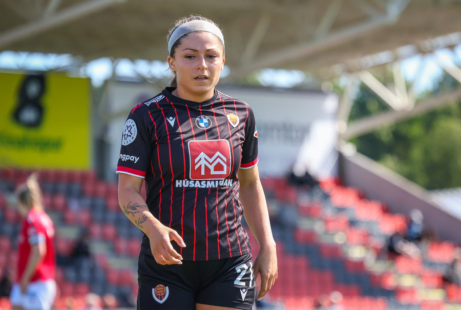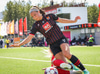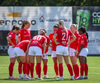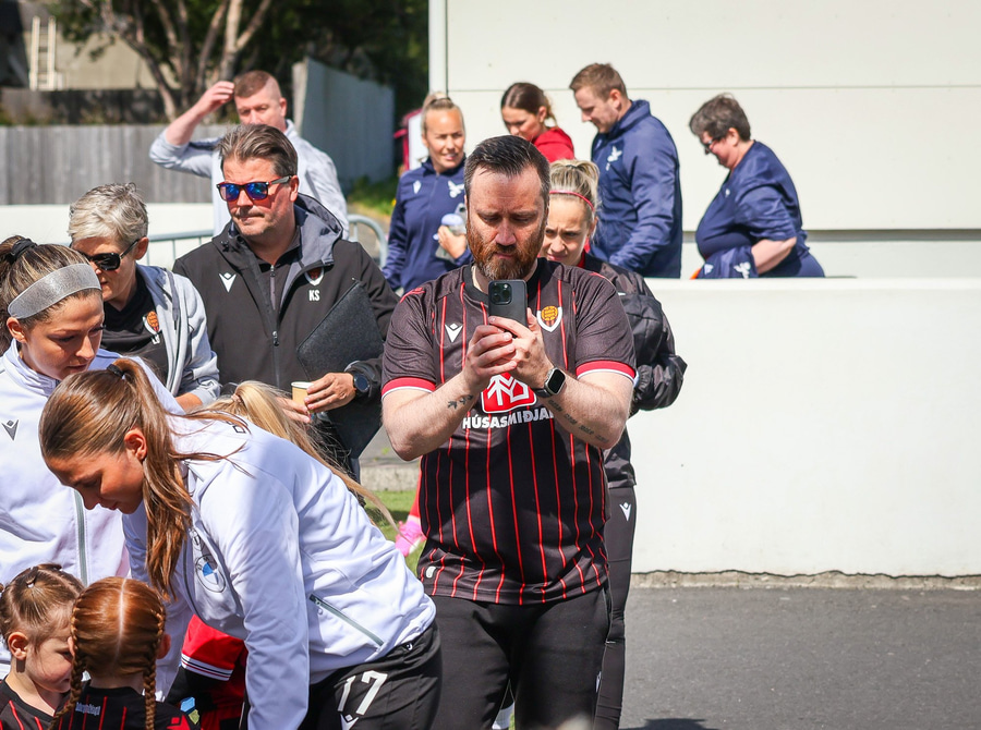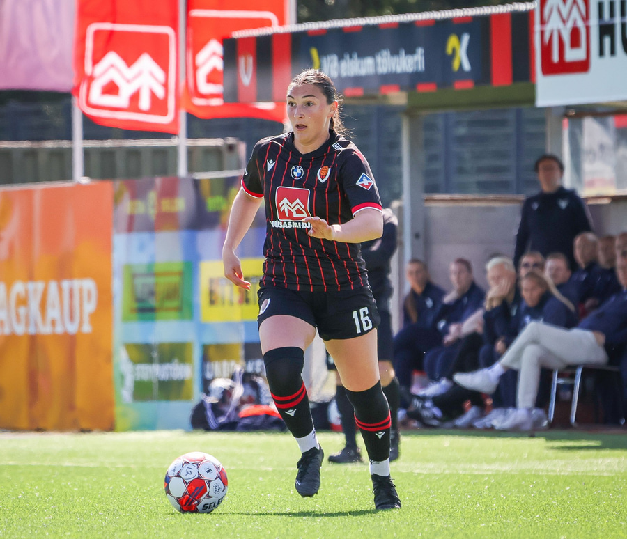 Heimakonur leika í sínum svörtu og rauðu treyjum, svörtu stuttbuxum og svörtu sokkum.