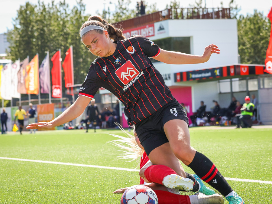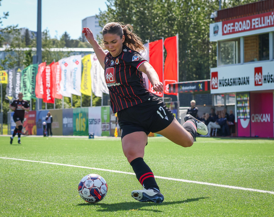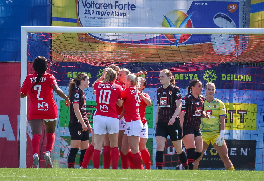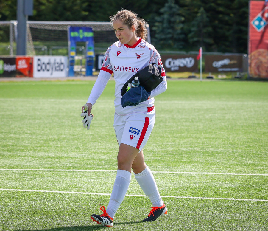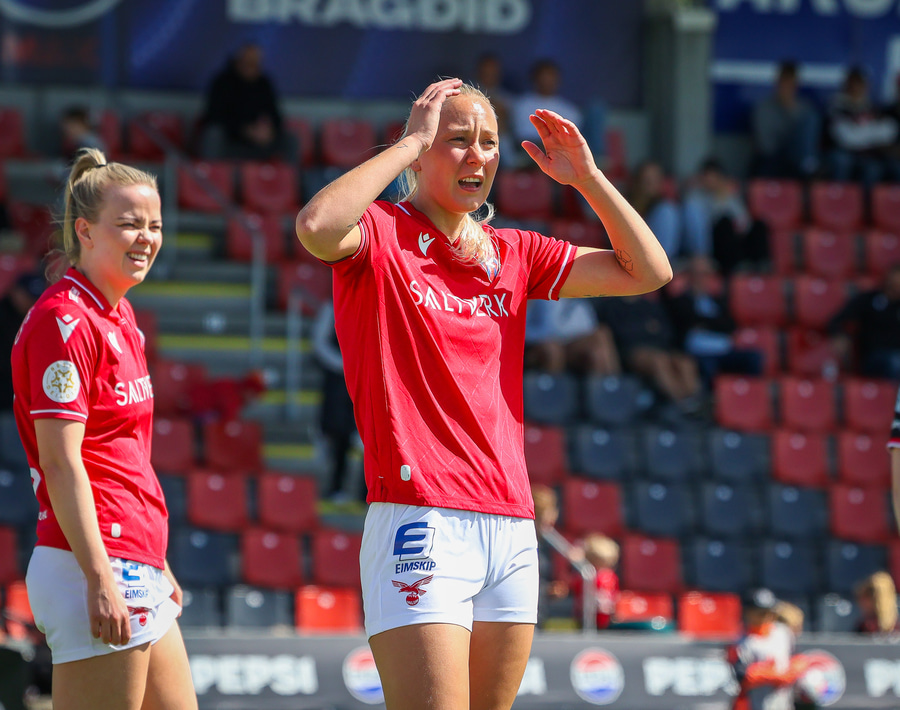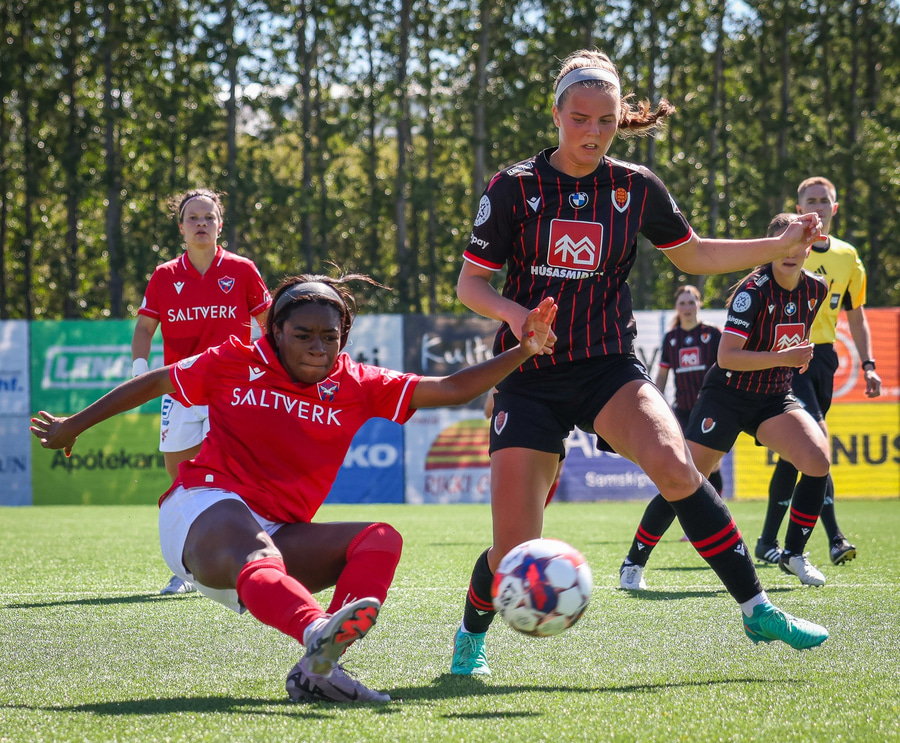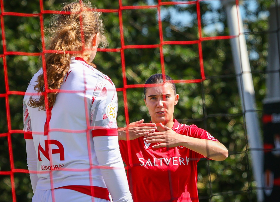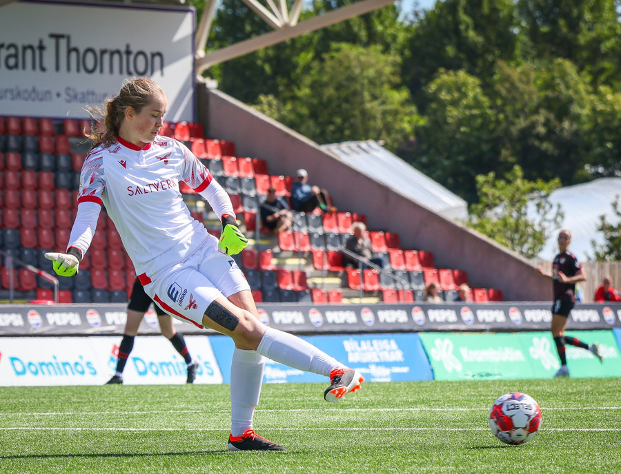 Amanda sleppur ein í gegn eftir misheppnaða hreinsun Ernu Guðrúnar. Þegar hún er komin ein á ein gegn Birtu reynir hún að vippa yfir hana en boltinn fer yfir.
