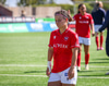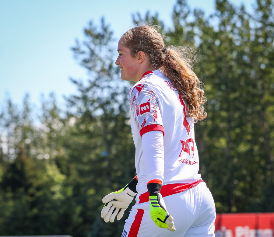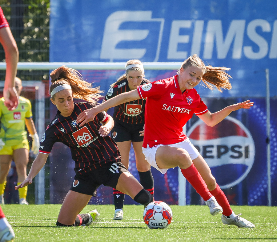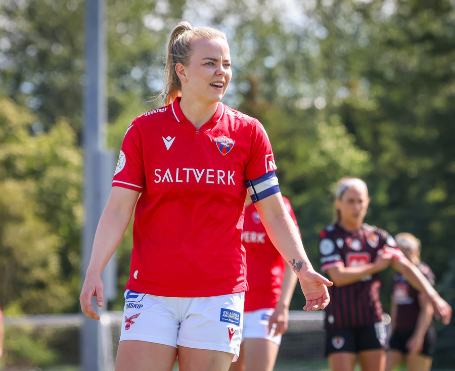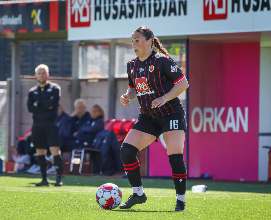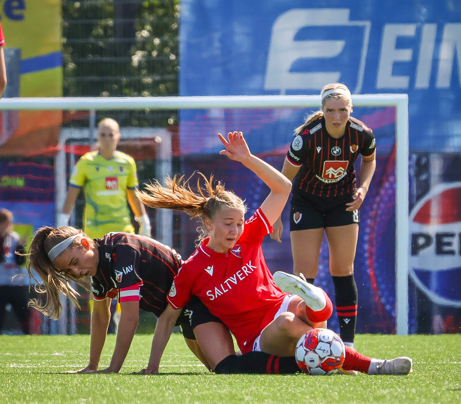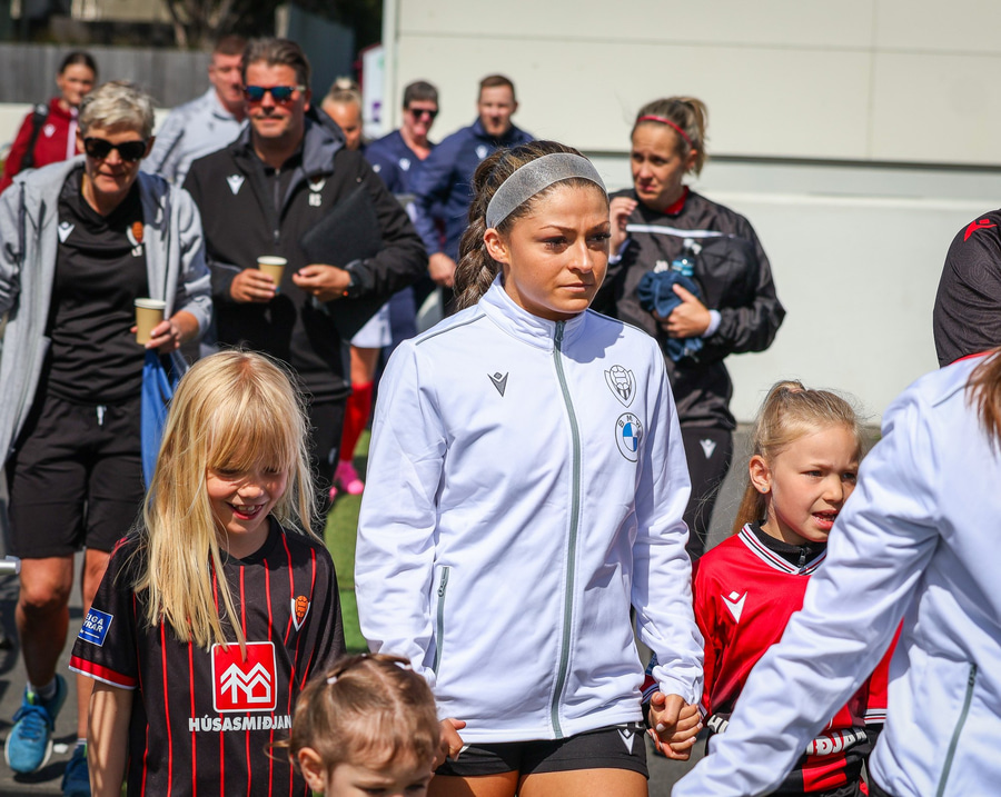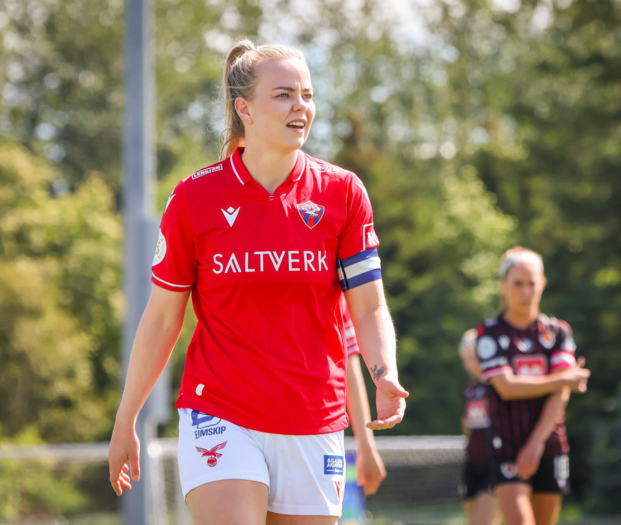 Amanda sleppur ein í gegn eftir misheppnaða hreinsun Ernu Guðrúnar. Þegar hún er komin ein á ein gegn Birtu reynir hún að vippa yfir hana en boltinn fer yfir.