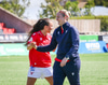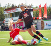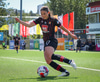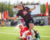 Shaina tekur spyrnuna sem fer yfir allan pakkann og yfir í innkast.