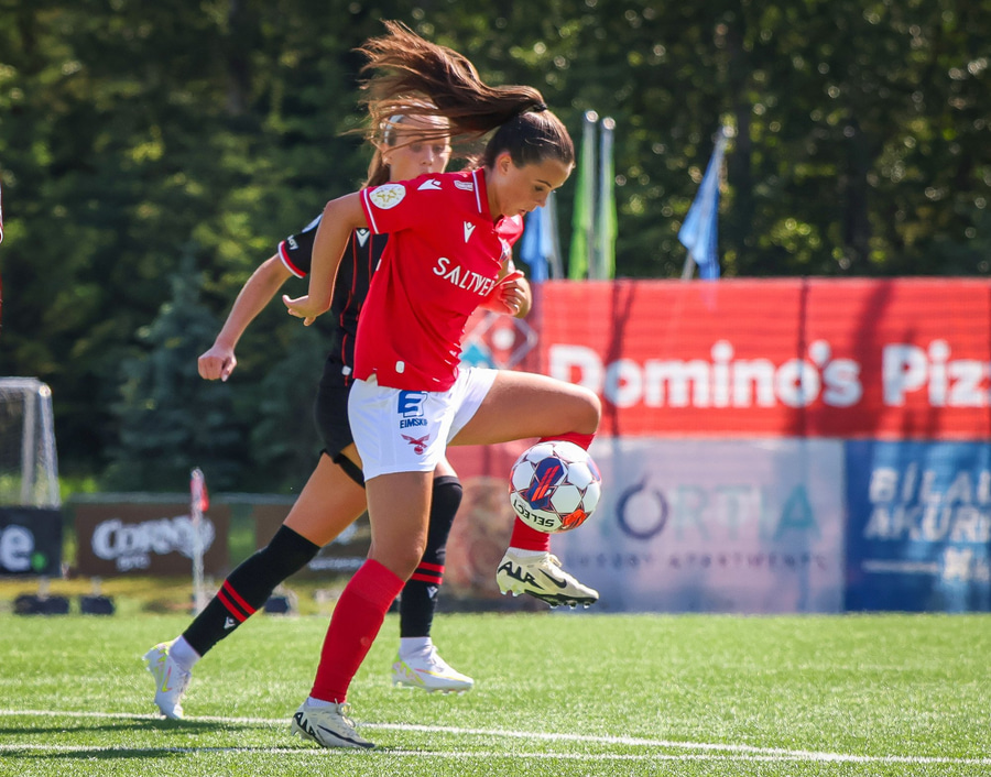 Shaina tekur spyrnuna stutt á Selmu og fær boltann svo aftur en hún er þá fyrir innan.