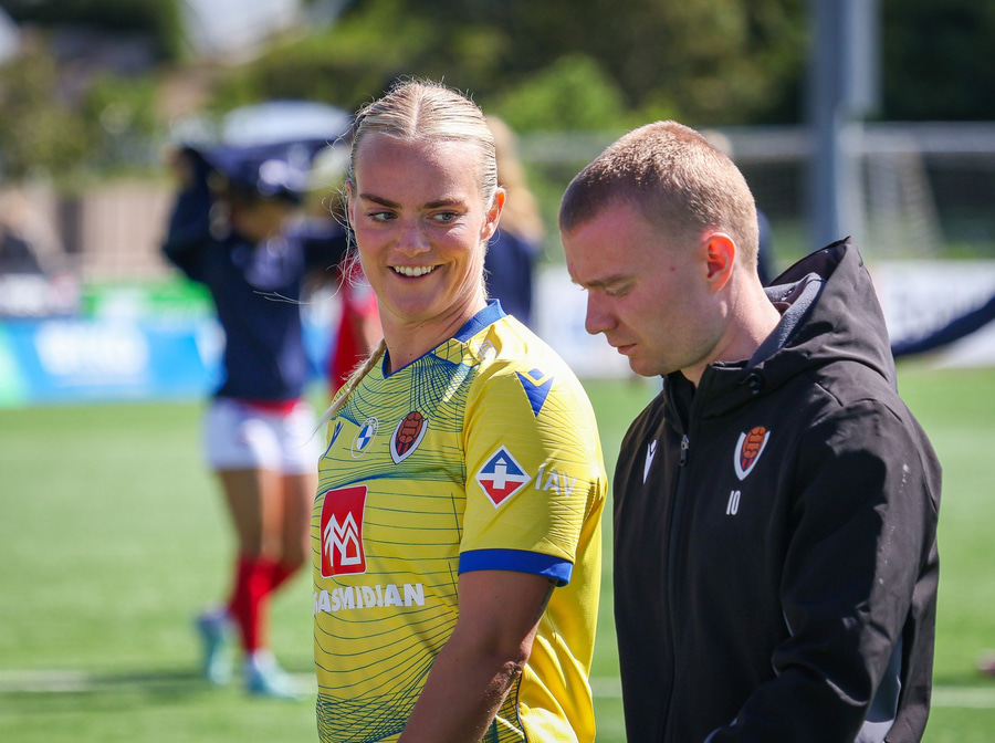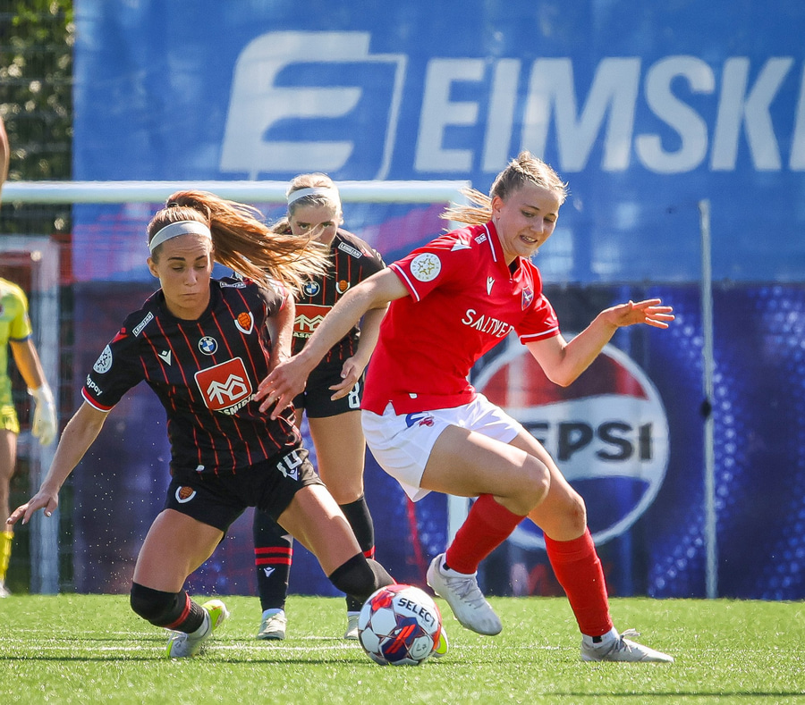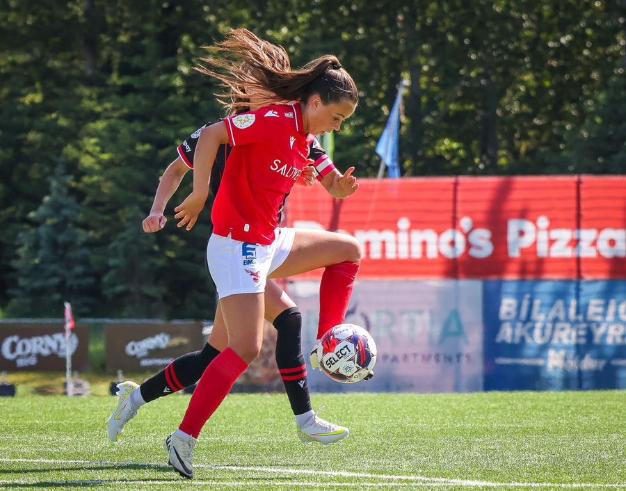 Valskonur eru í hálfgerðu brasi að spila boltanum upp völlinn og Kate Cousins dúndrar boltanum upp völlinn og aftur fyrir varnarlínu Víkinga. Þá er Ísabella skyndilega komin ein í gegn á móti Birtu og klárar mjög vel.