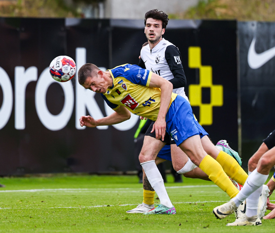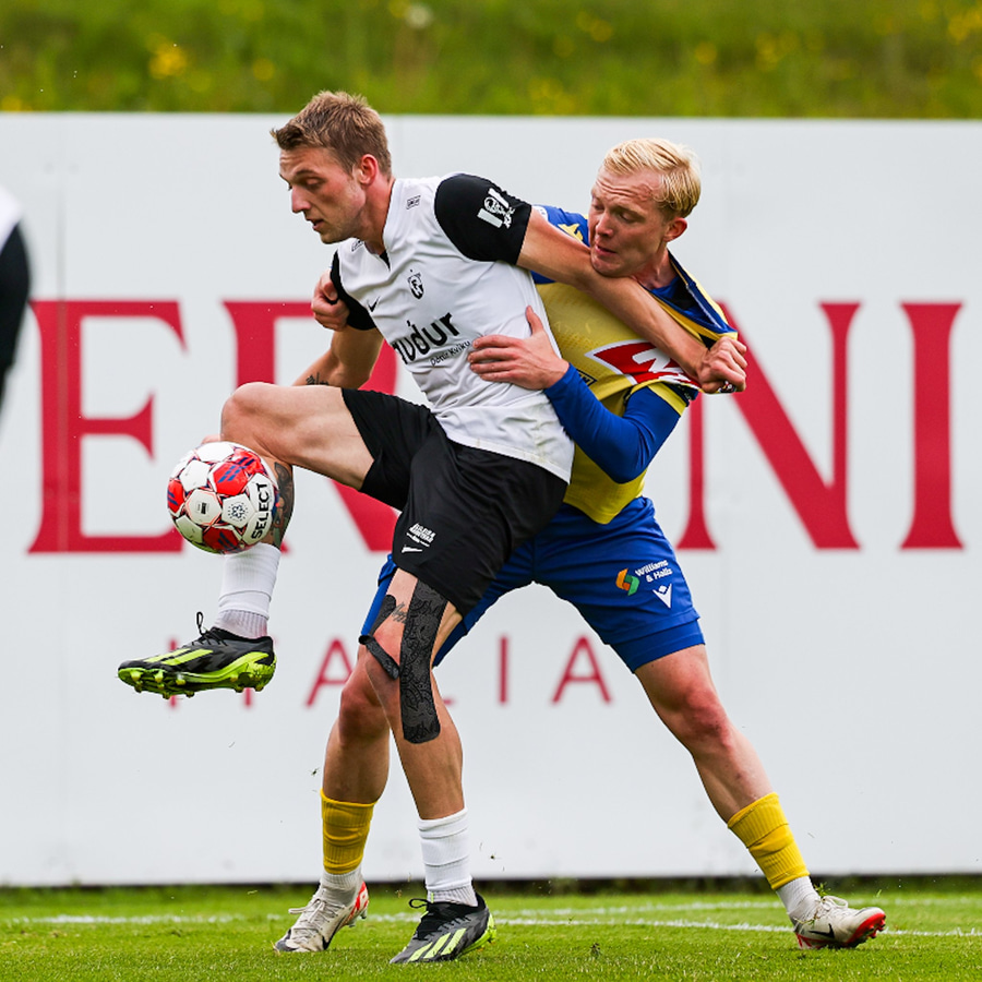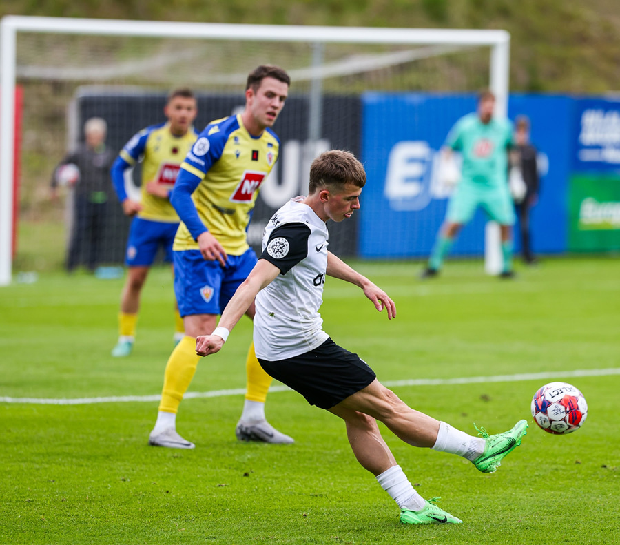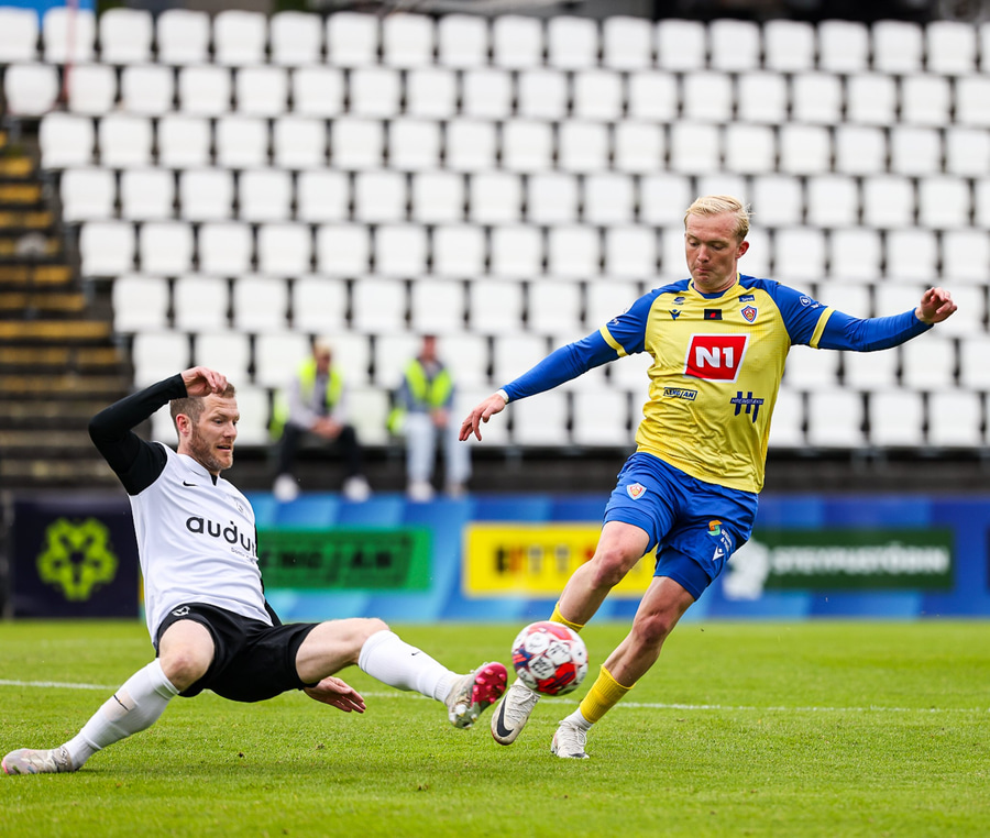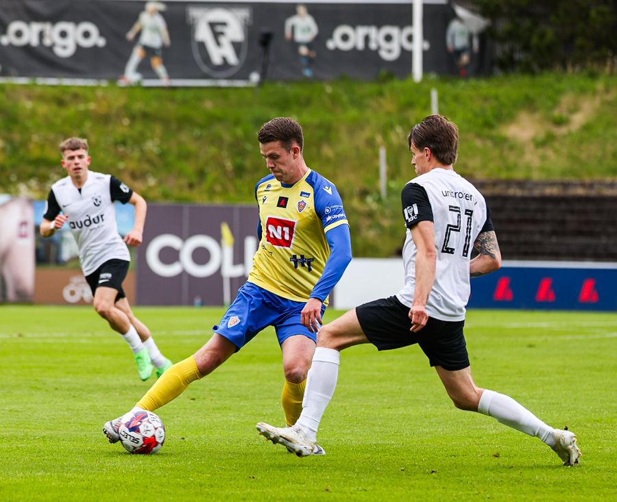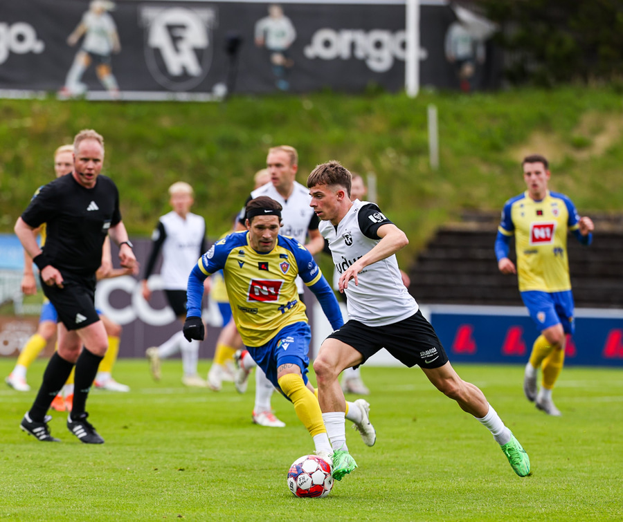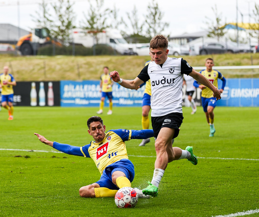 Vuk er með boltan út á hægri kanti og hann fær að valsa inn á völlinn nokkuð óáreittur. Hann leggur þá boltan fyrir Kjartan rétt fyrir utan teig sem tekur skotið en í varnarmann og sóknir fjarar út eftir það.