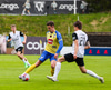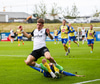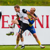 Langur bolti fram og Harley bara sloppinn í gegn. Fyrsta snertingin hans er ekki alveg nógu góð, hann setur boltan of mikið til hliðar og tekur þá skotið úr erfiðu færi og framhjá.