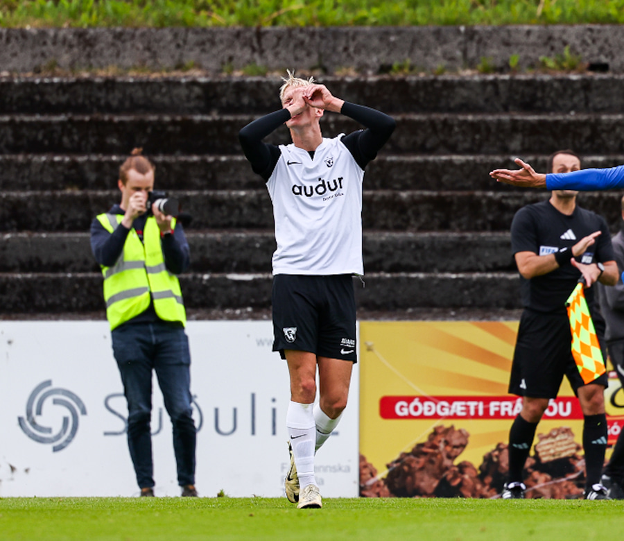 Grímsi setur boltan niður í hægra hornið. Sindri fer í rétta átt en nær ekki til boltans.