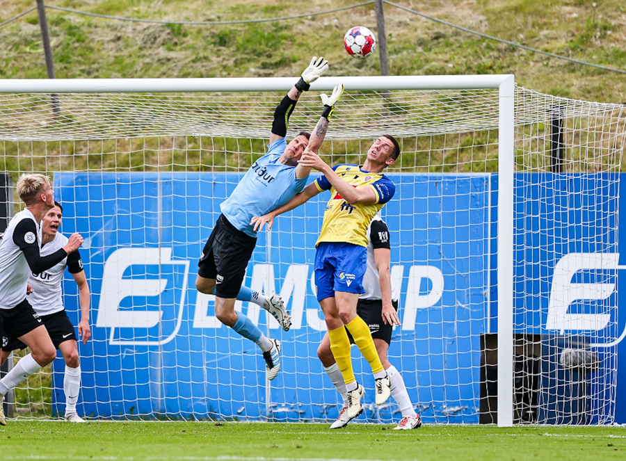 Löng sending fram á Grímsa sem er sloppinn einn í gegn. Sindri kemur út úr markinu og Grímsi chippar yfir hann, þá tekur Sindri, Grímsa niður.