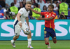 Bellingham tekur geggjaðan snúning, sýnir gæði sín og hristir varnarmenn Spánar af sér áður en hann tekur þéttingsfast skot frá D-boganum. Framhjá.