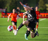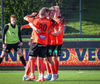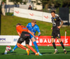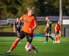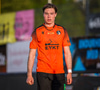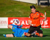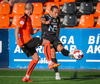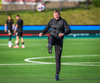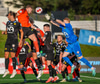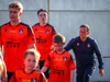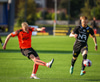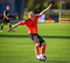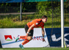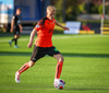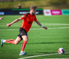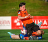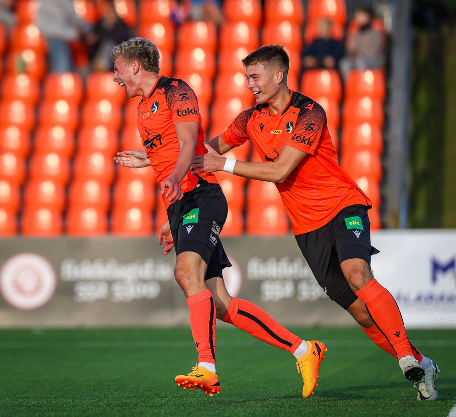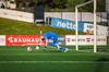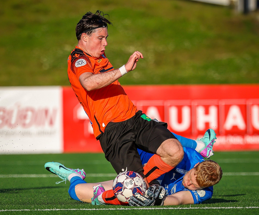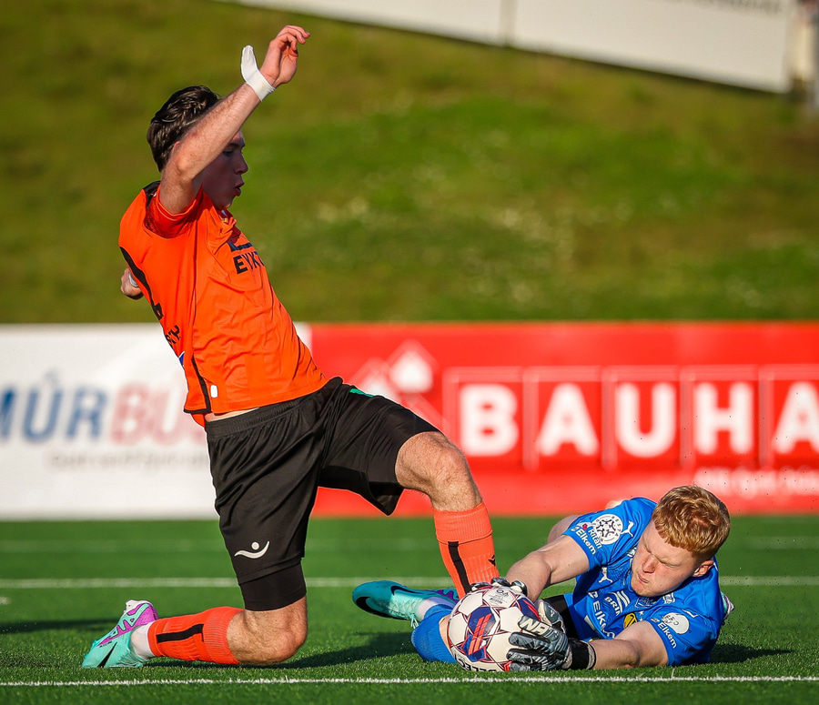 Arnór Breki tekur spyrnuna inn á teiginn sem fer beint á ennið á Orra. Orri tekur skallan á markið en Árni Marínó ver í annað horn.