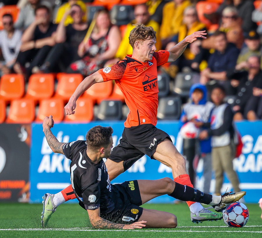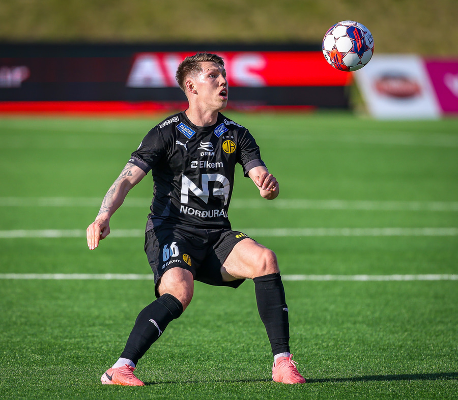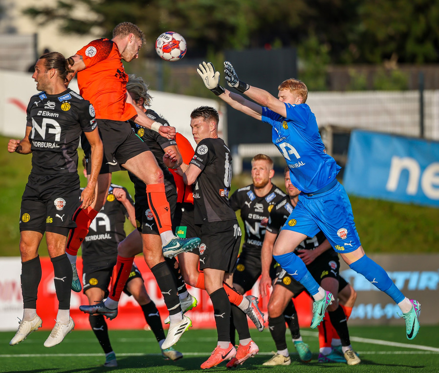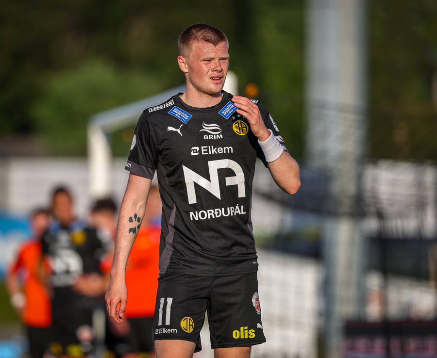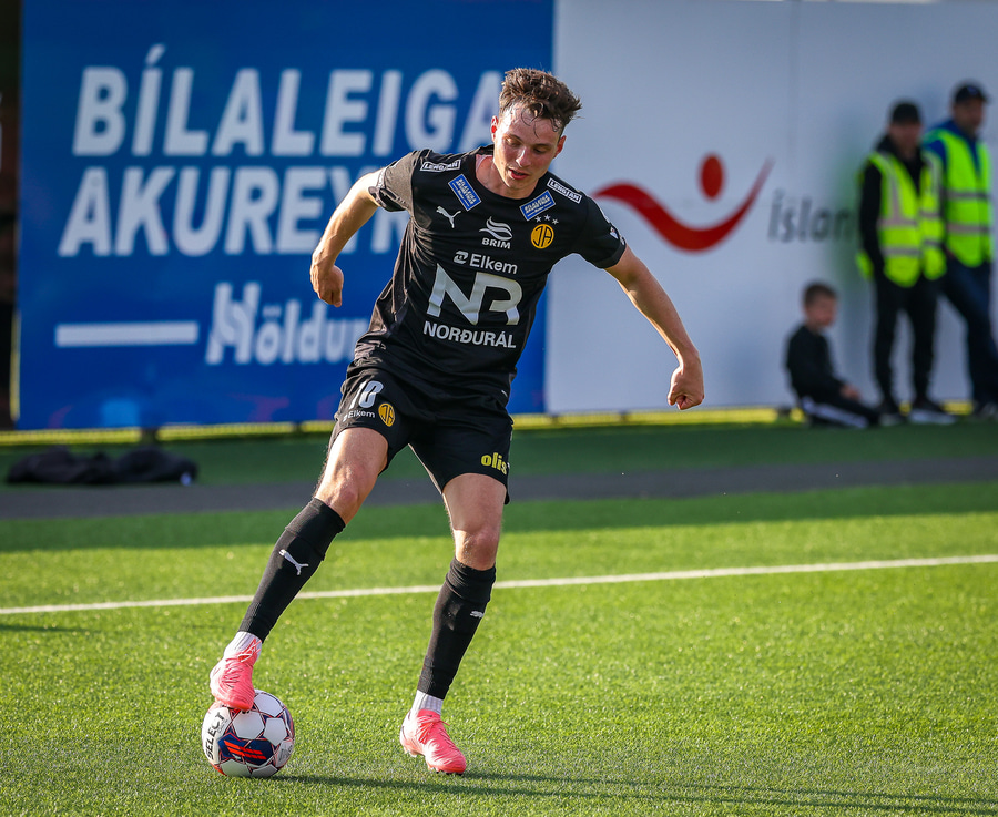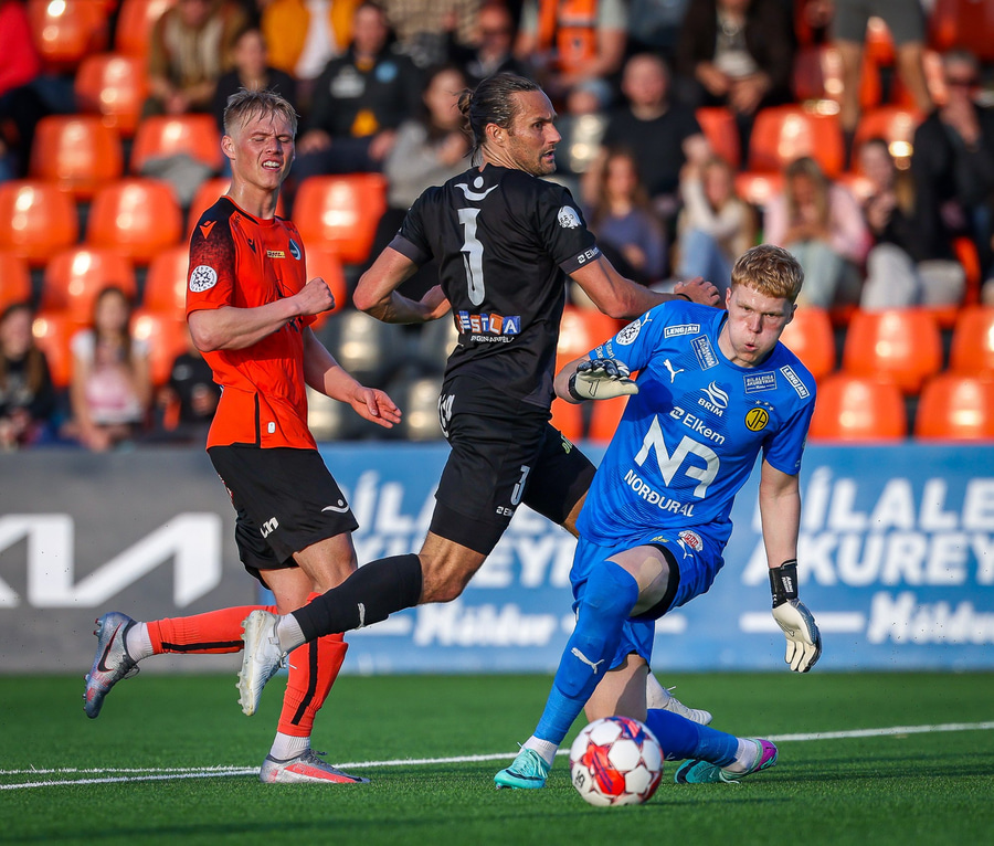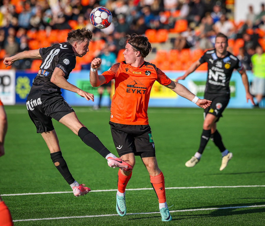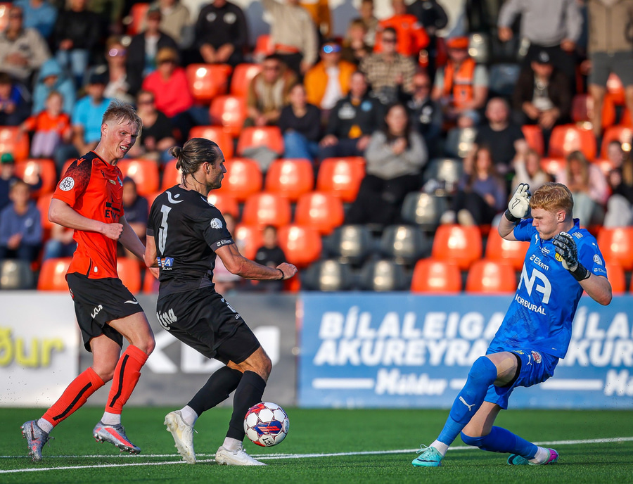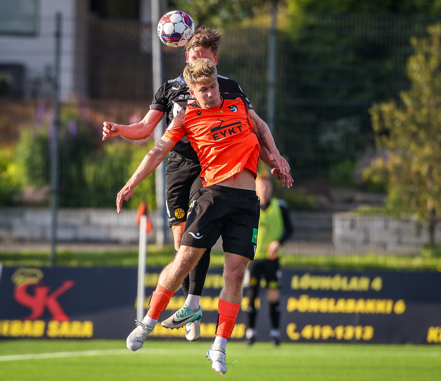 Johannes Vall brunar upp vinstri vænginn og kemur með boltann fyrir á Viktor Jóns sem skallar boltann rétt framhjá. Hann var gjörsamlega einn og óvaldaður en gerði vel að ná skallanum.